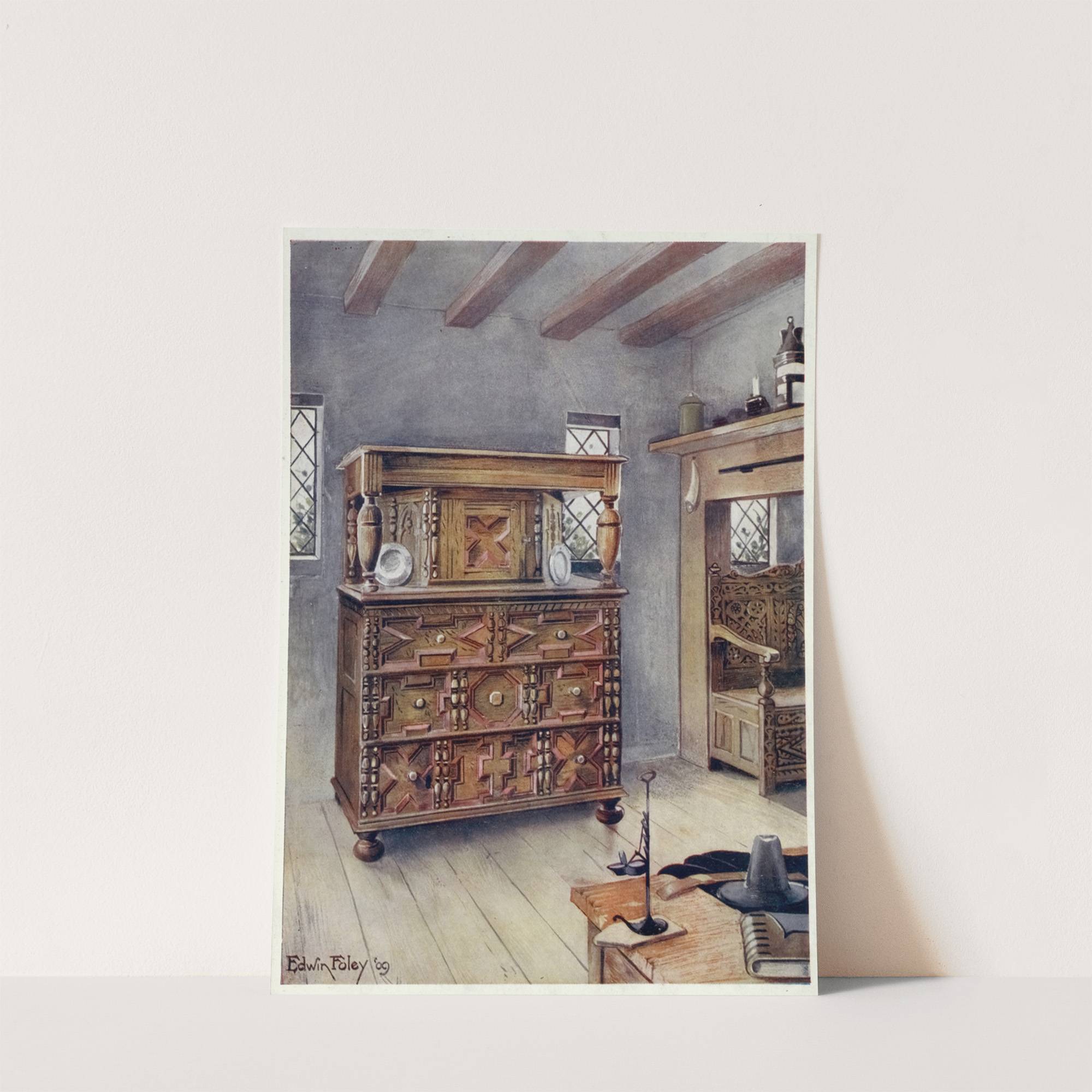 The Putnam cupboard of English oak and cedar, Carved settle of American Oak by Edwin Foley - Wall Art Print