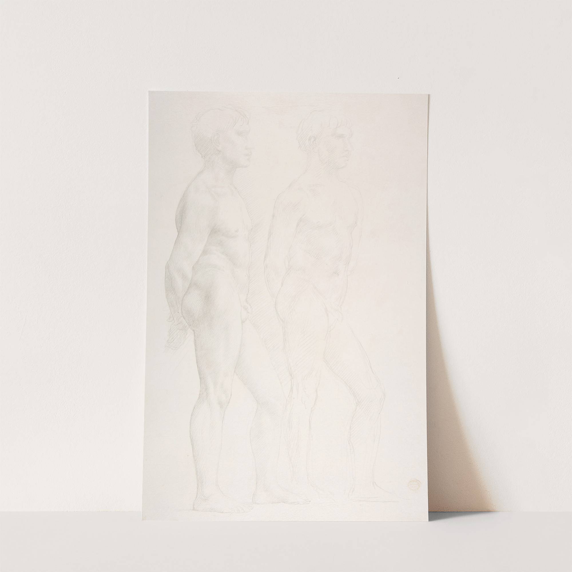 Introducing "Study of Two Figures" by Alphonse Legros, a captivating piece that explores the interplay between subtle motion and minimalist form. This artwork features two indistinct figures depicted in delicate, almost ethereal grayscale lines that blend seamlessly into the white...