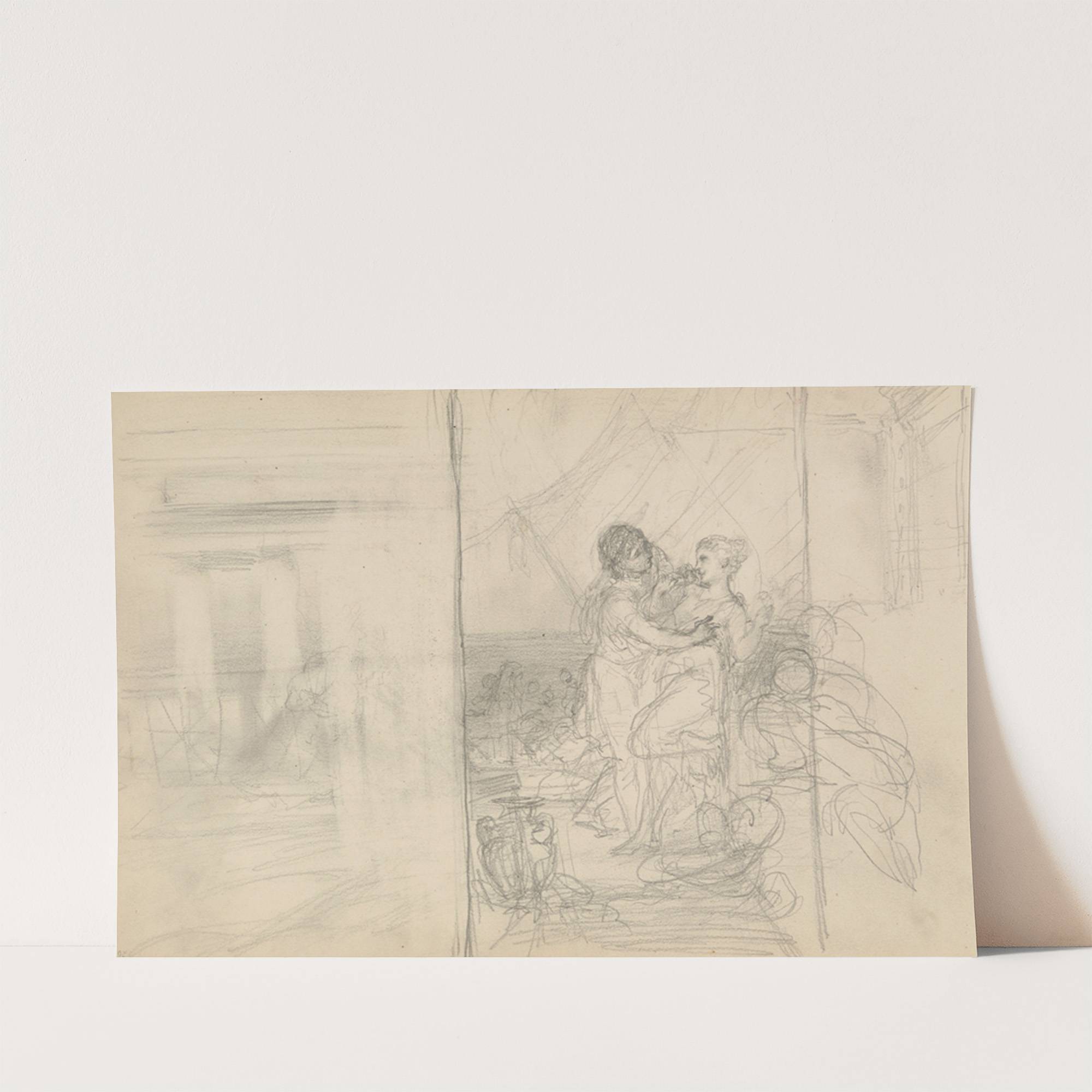 szkic obejmującej się pary stojącej na tarasie, zarys fragmentu budowli z kolumnami by Henryk Siemiradzki - Wall Art Print