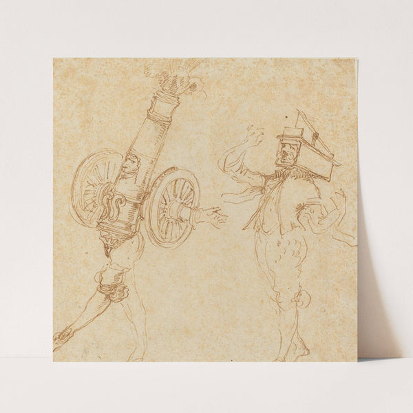 Two Men in Masquerade Costumes – A Cannon Firing and a Cat Inside a Mousetrap by Stefano Della Bella - Wall Art Print