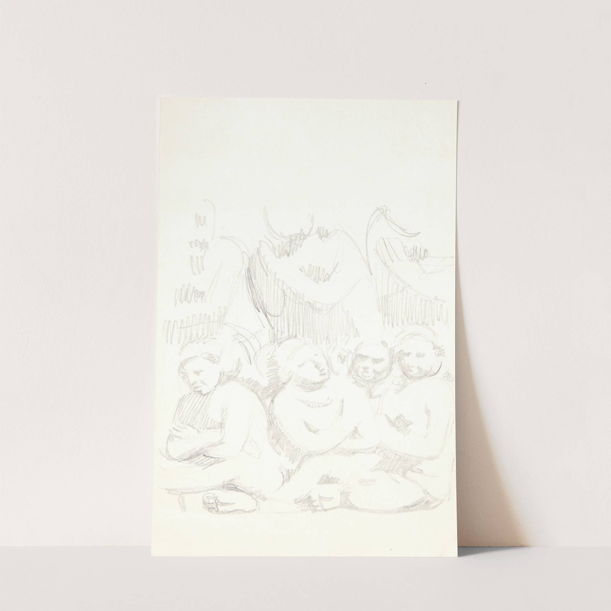 Gruppe med siddende figurer med korslagte arme i forgrunden Studieblad efter relieffer i Borobudur, Java by Svend Rathsack - Wall Art Print