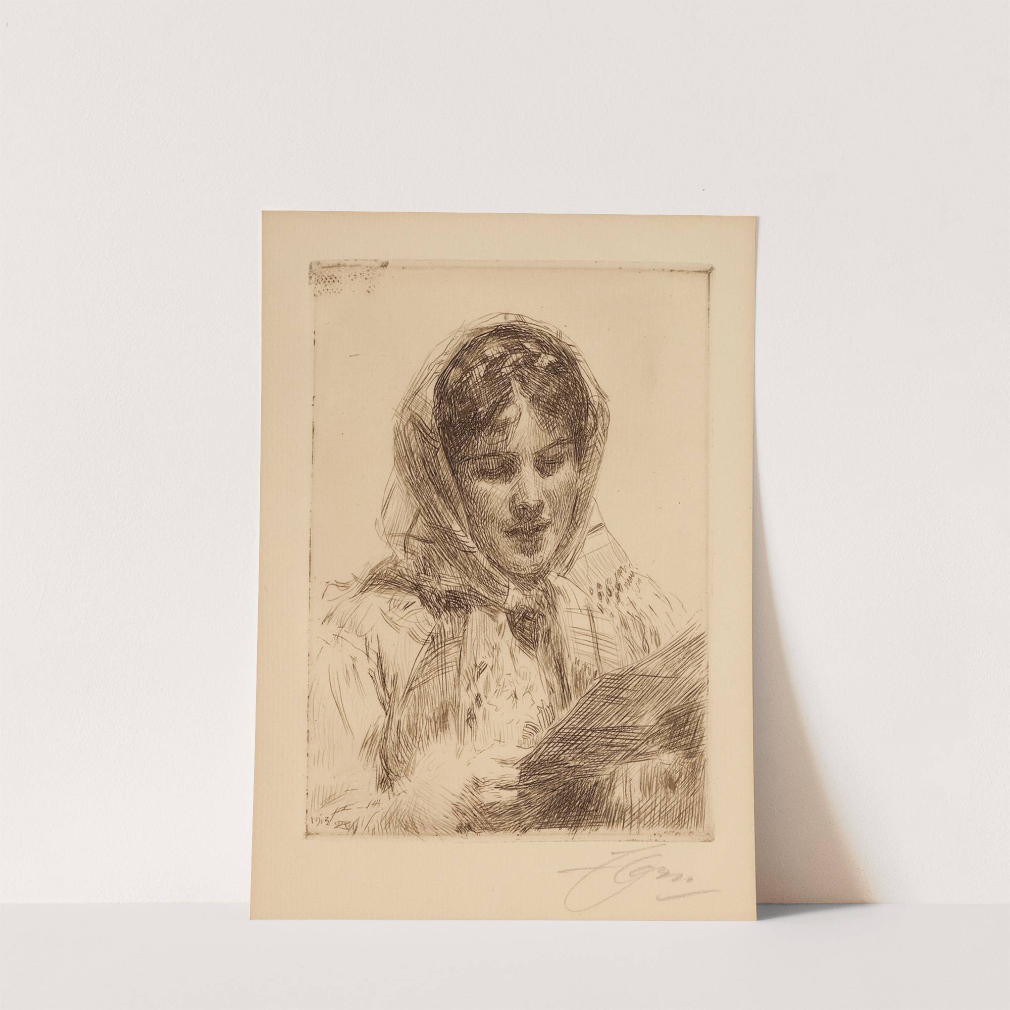 This elegant print features "The Letter" by Anders Zorn, showcasing the artist's masterful use of pencil and ink to create a poignant portrait. The subject is a young woman with delicate facial features and a gentle expression, her gaze downward...
