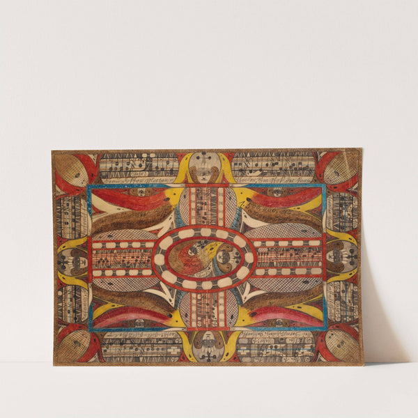 This vibrant art print features a strikingly complex and dynamic composition inspired by the surreal style of Adolf Wölfli. The central focus is a large circular pattern with alternating red and white segments, reminiscent of clock hands or geometric shapes,...