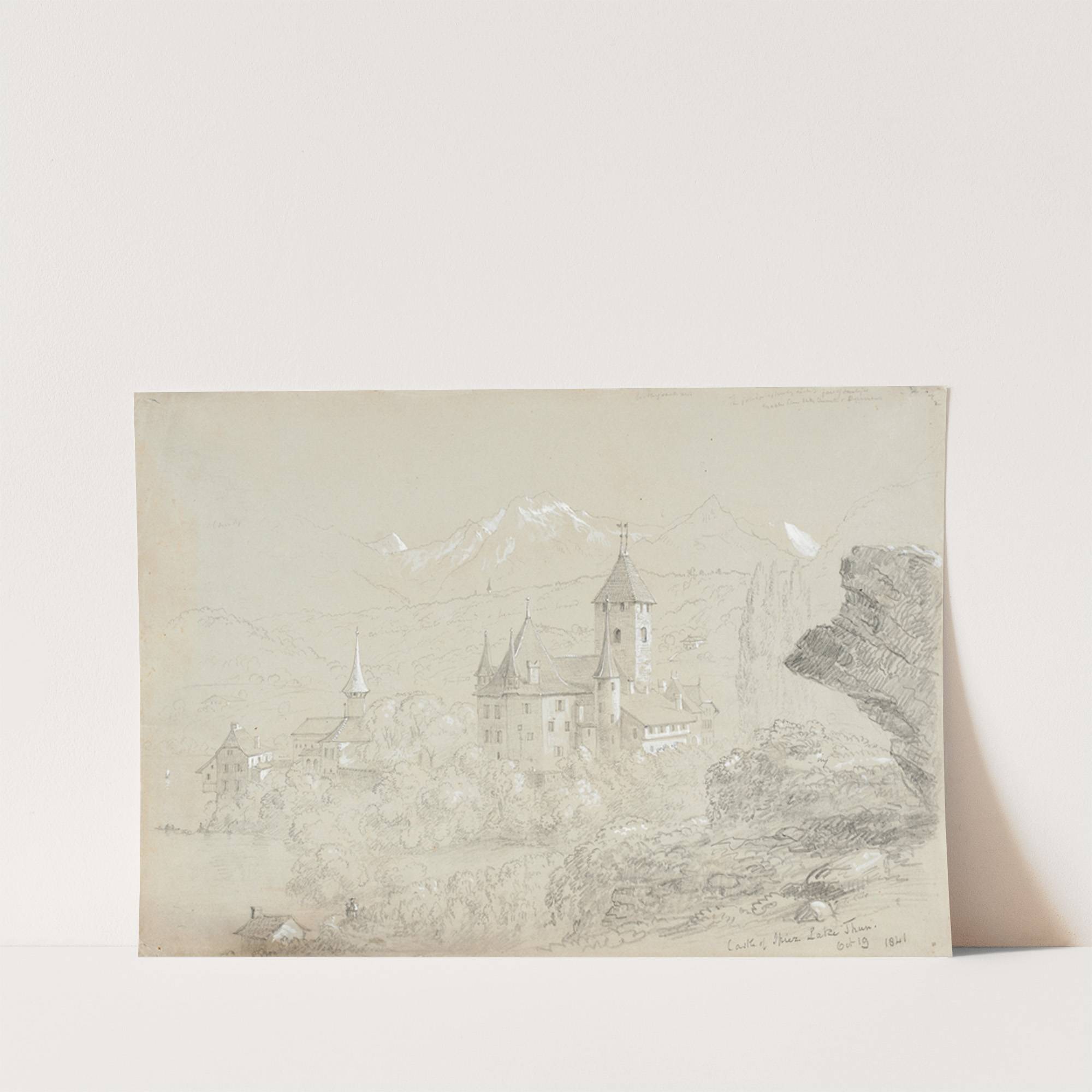 This delicate pencil sketch features the charming "Castle of Spiez, Lake Thun" by Thomas Cole. The artist has meticulously captured the tranquil beauty of this historic European castle set against a serene mountainous backdrop. The central focus is on the...