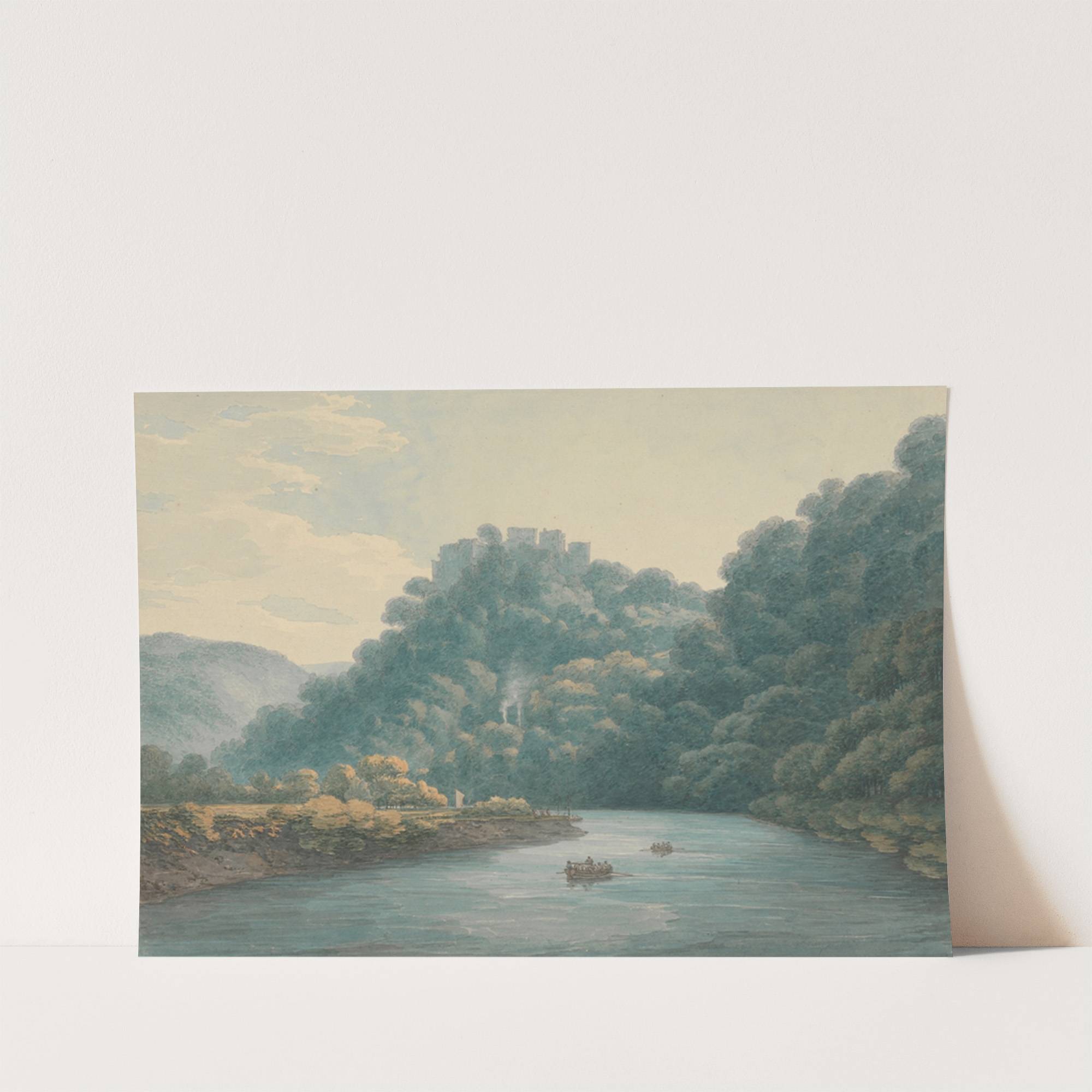 "Goodrich Castle on the Wye" by Thomas Hearne is a captivating art print featuring a serene river landscape with a touch of mystique. The painting depicts a calm river flowing gently through a lush, verdant valley surrounded by dense trees...