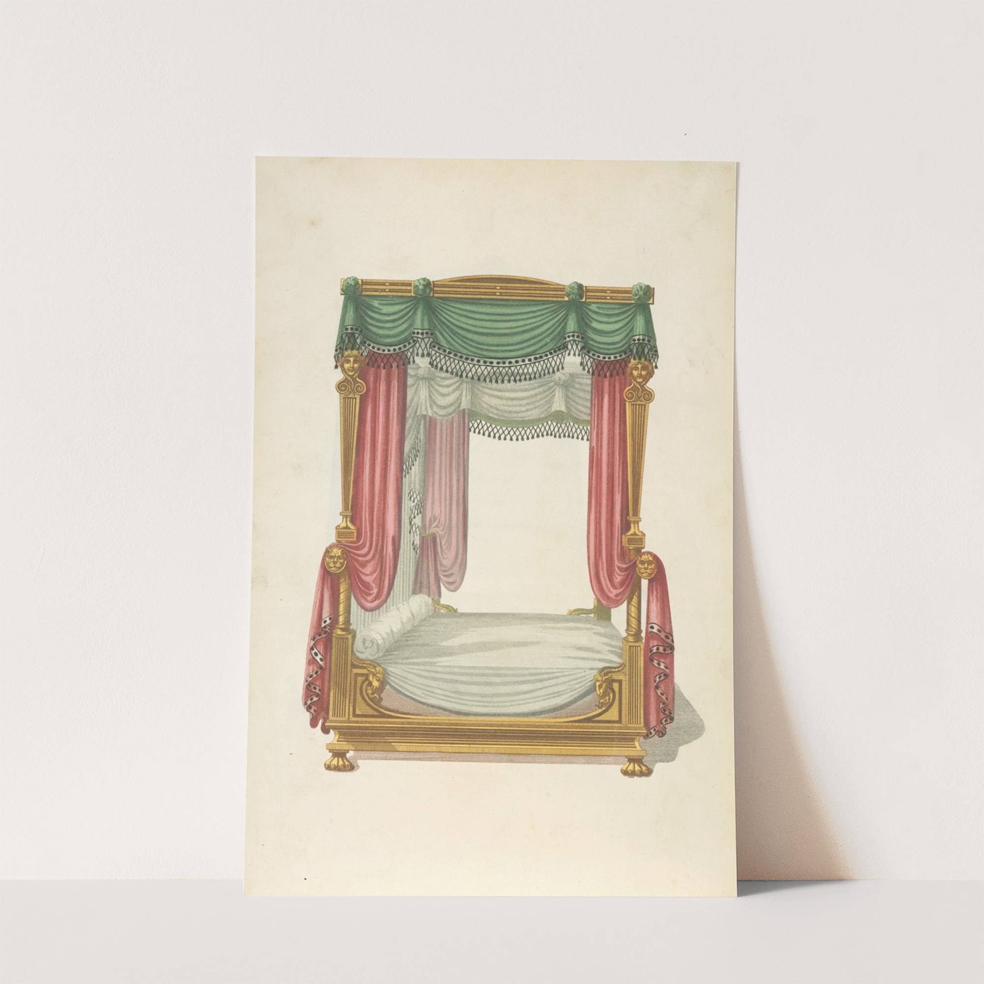 Canopy bed with green and red drapery. by Thomas Sheraton - Wall Art Print