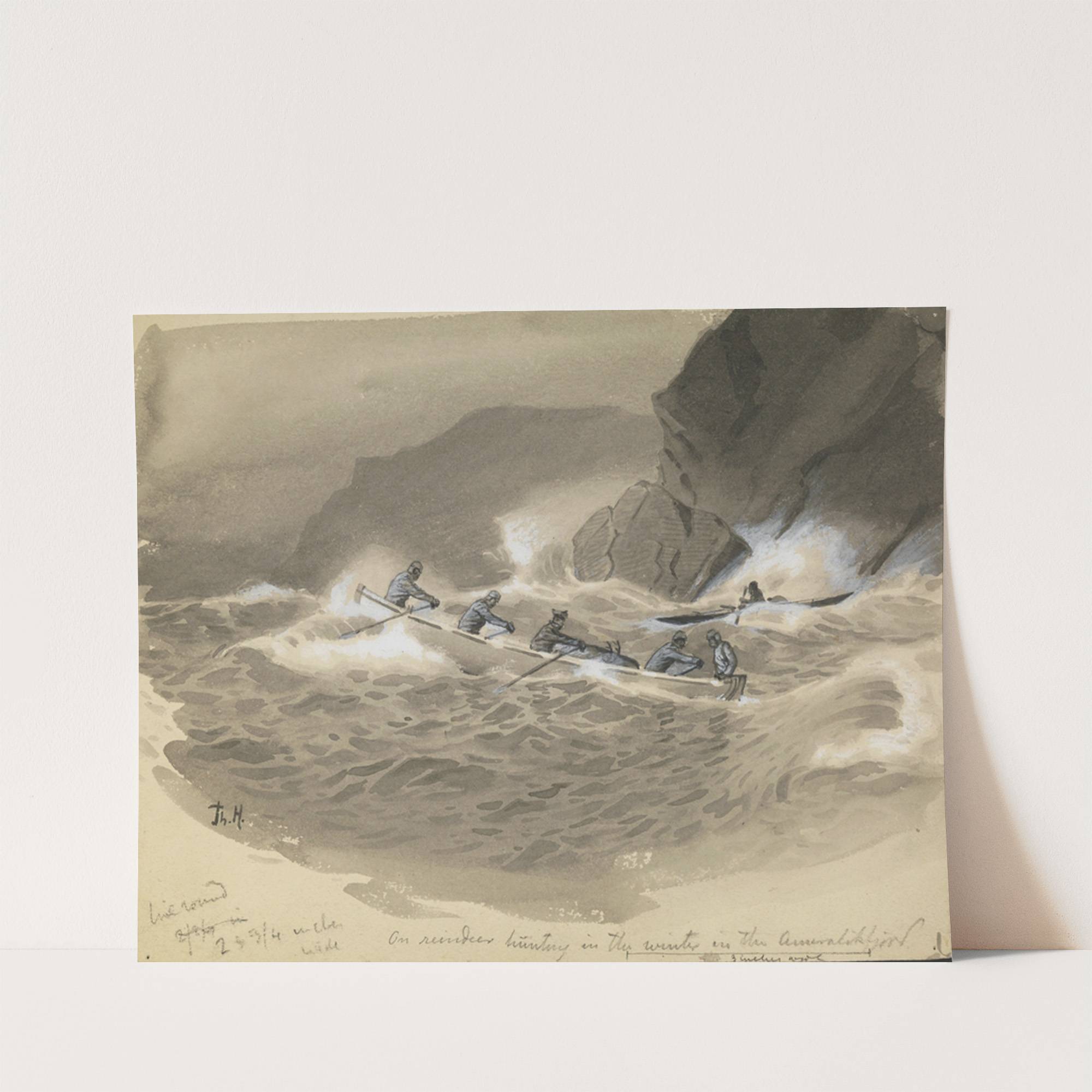 Ekspedisjonen i en båt etter jakten på reinsdyr ved Ameralikfjorden (Grønlands vestkyst) (1889) by Thorolf Holmboe - Wall Art Print