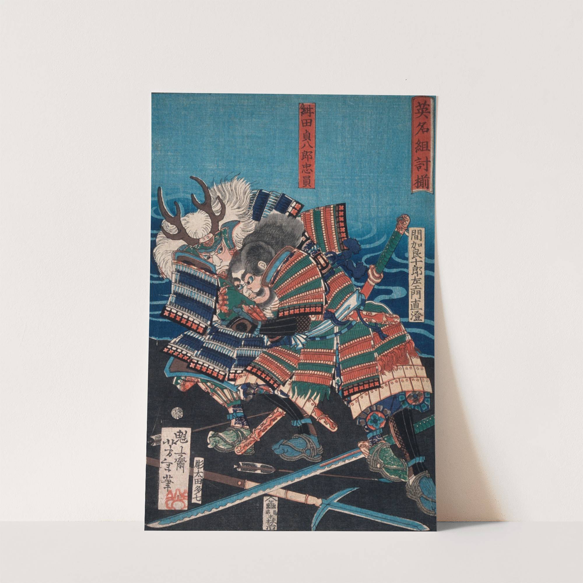 Konda Teihachirō Tadakazu and Makara Jūrōzaemon Naozumi Grappling by the Water by Tsukioka Yoshitoshi - Wall Art Print