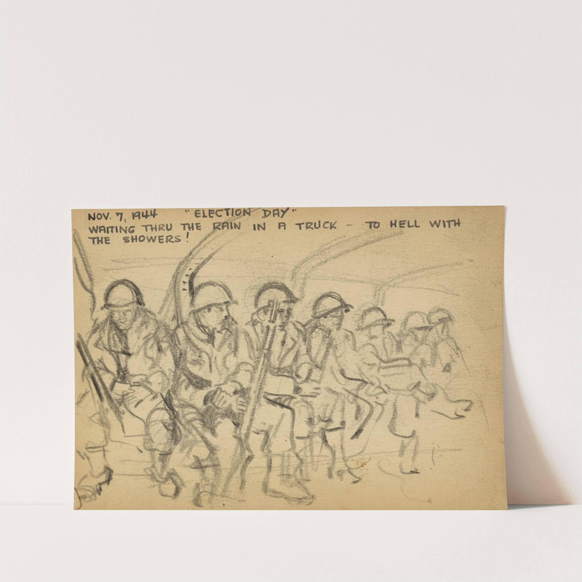 ‘Election Day’ Waiting thru the rain in a truck – to hell with the showers! by Victor Alfred Lundy - Wall Art Print