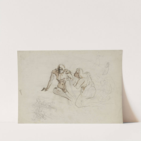 Auf dem Boden sitzender, übellauniger männlicher Akt, von einer neben ihm knienden weiblichen Gestalt umsorgt , sowie weitere figürliche Skizzen by Victor Müller - Wall Art Print
