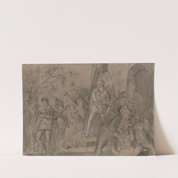 Ein wunderlicher alter Mann weist auf ein vor ihm liegendes Hündchen und richtet das Wort an einen Herrscher, dieser und Umstehende greifen zu ihren Waffen by Victor Müller - Wall Art Print