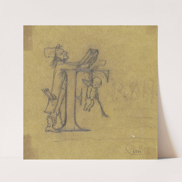 Humoristische Initiale F; Lesender Gelehrter, an dessen F-förmigen Pult ein erhängter Putto baumelt by Victor Müller - Wall Art Print