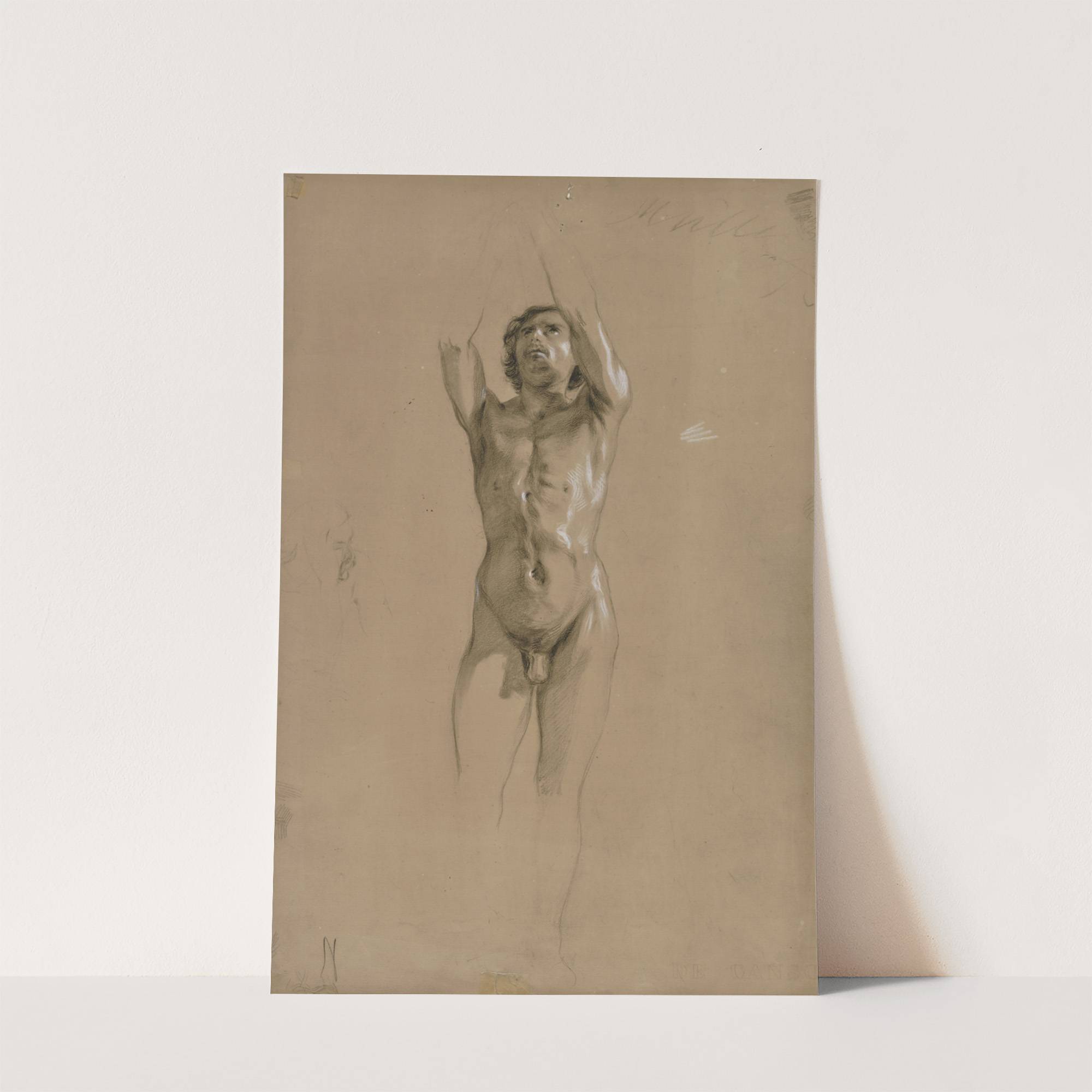 Stehender männlicher Akt in Vorderansicht, mit erhobenen Armen by Victor Müller - Wall Art Print