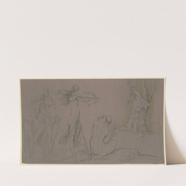 Vier weibliche nackte Bogenschützen schießen auf einen an einem Baum gebundenen Mann by Victor Müller - Wall Art Print