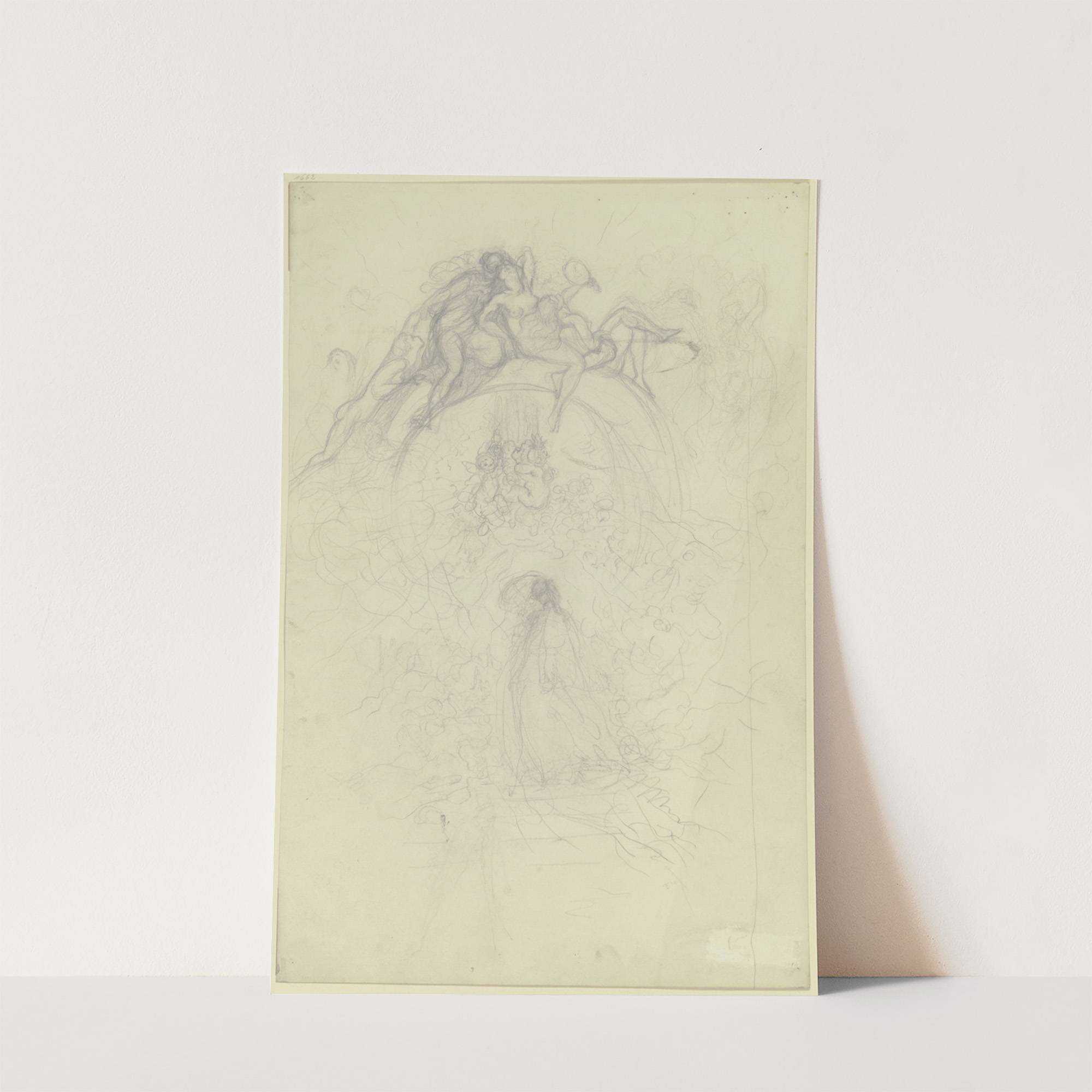 Weibliche Rückenfigur, sich auf einen runden Rahmen zubewegend, auf dem weibliche Aktfiguren lagern by Victor Müller - Wall Art Print