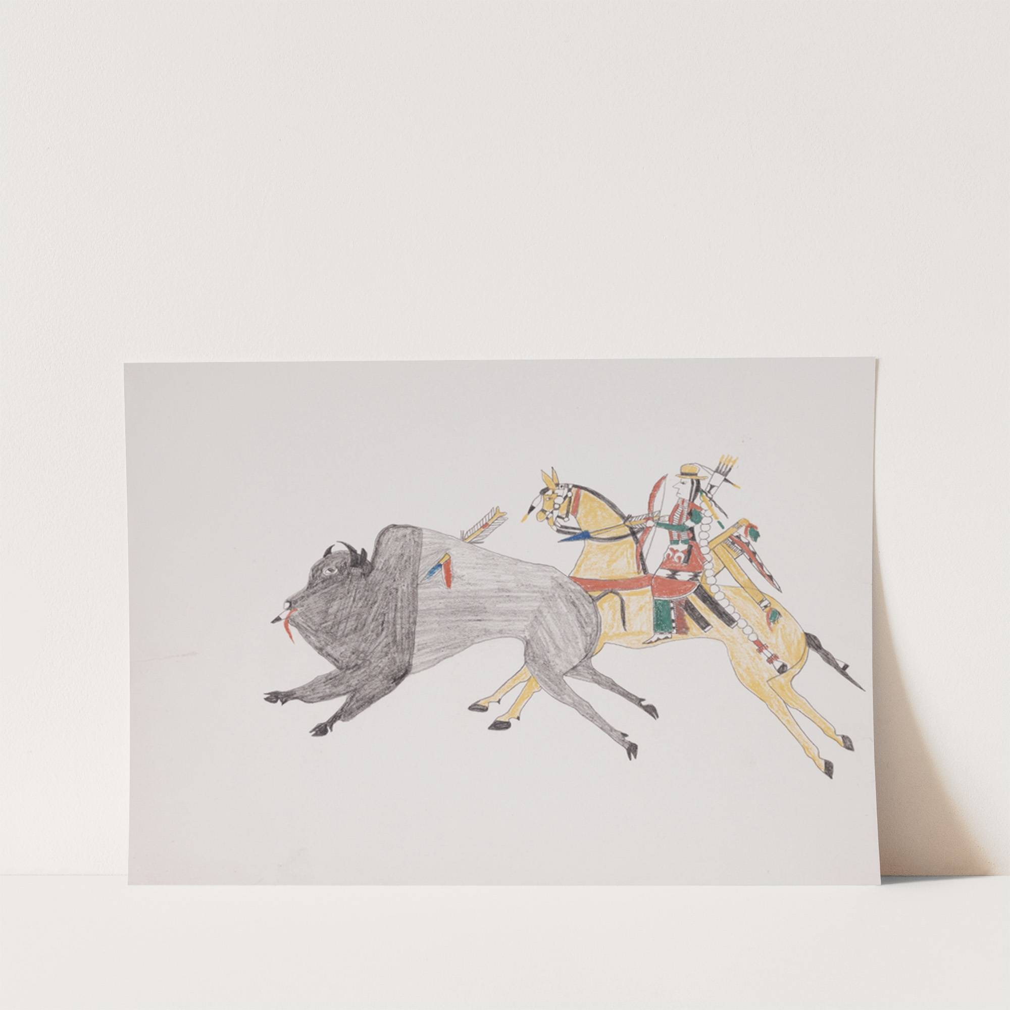 Bison hunt with Indian on horseback. by Howling Wolf - Wall Art Print