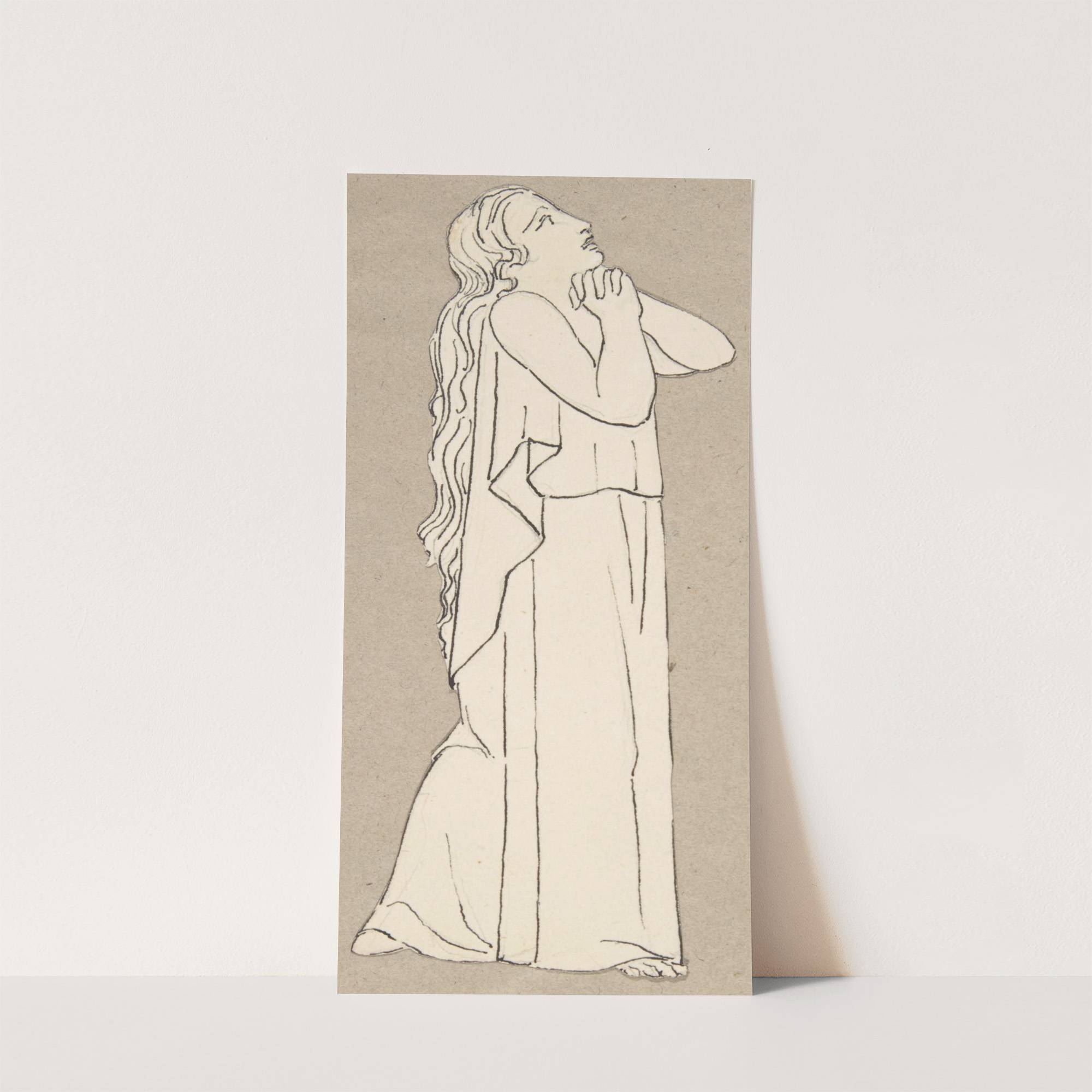This elegant art print showcases a minimalist line drawing of a standing woman with long, flowing hair, inspired by the style of John Flaxman. The woman is depicted in profile, facing upward, with her hands gently clasped near her chin....