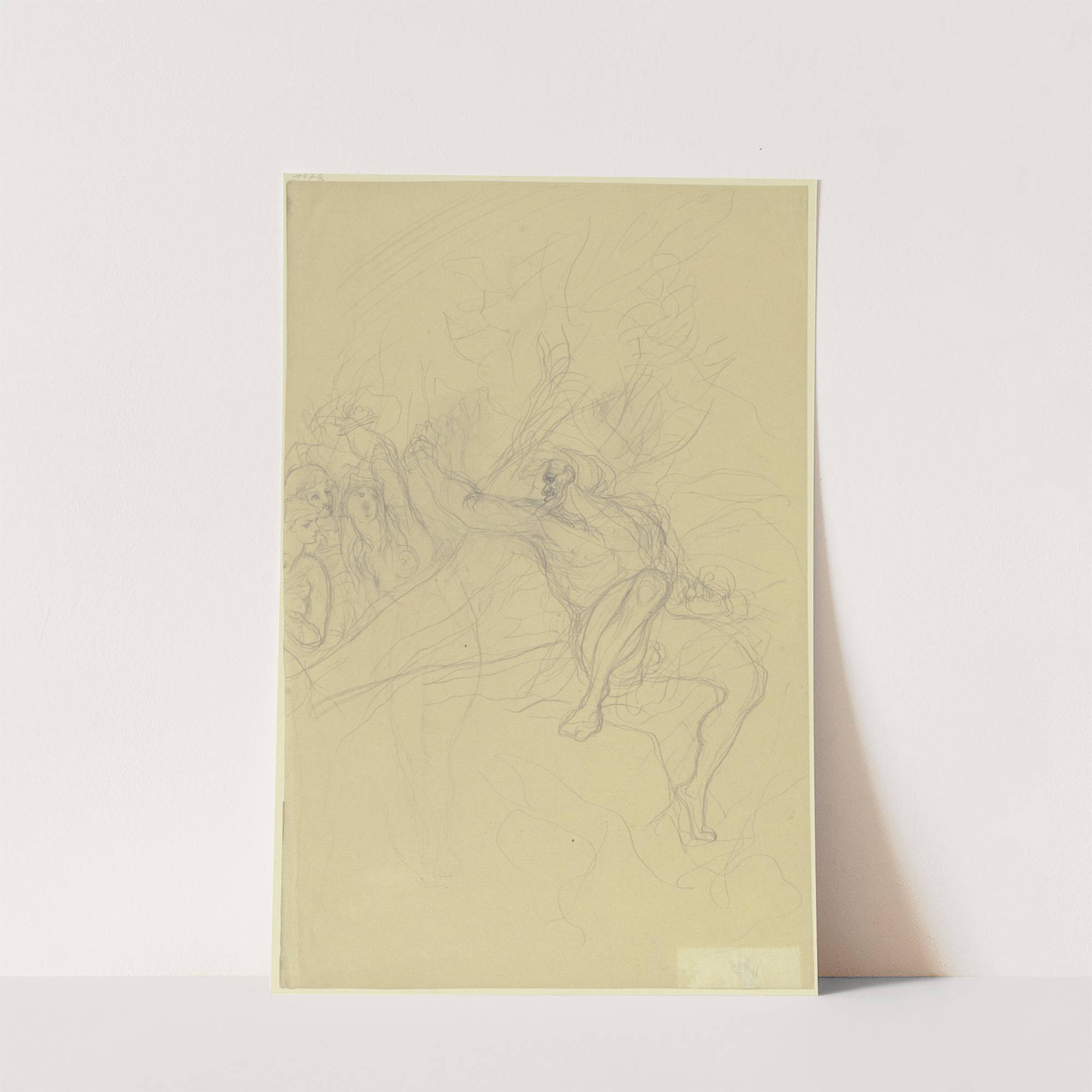 Ein alter, aufgestützt liegender nackter Mann droht einer links hinter ihm stehenden Gruppe von zwei Mädchen und einem Jüngling by Victor Müller - Wall Art Print