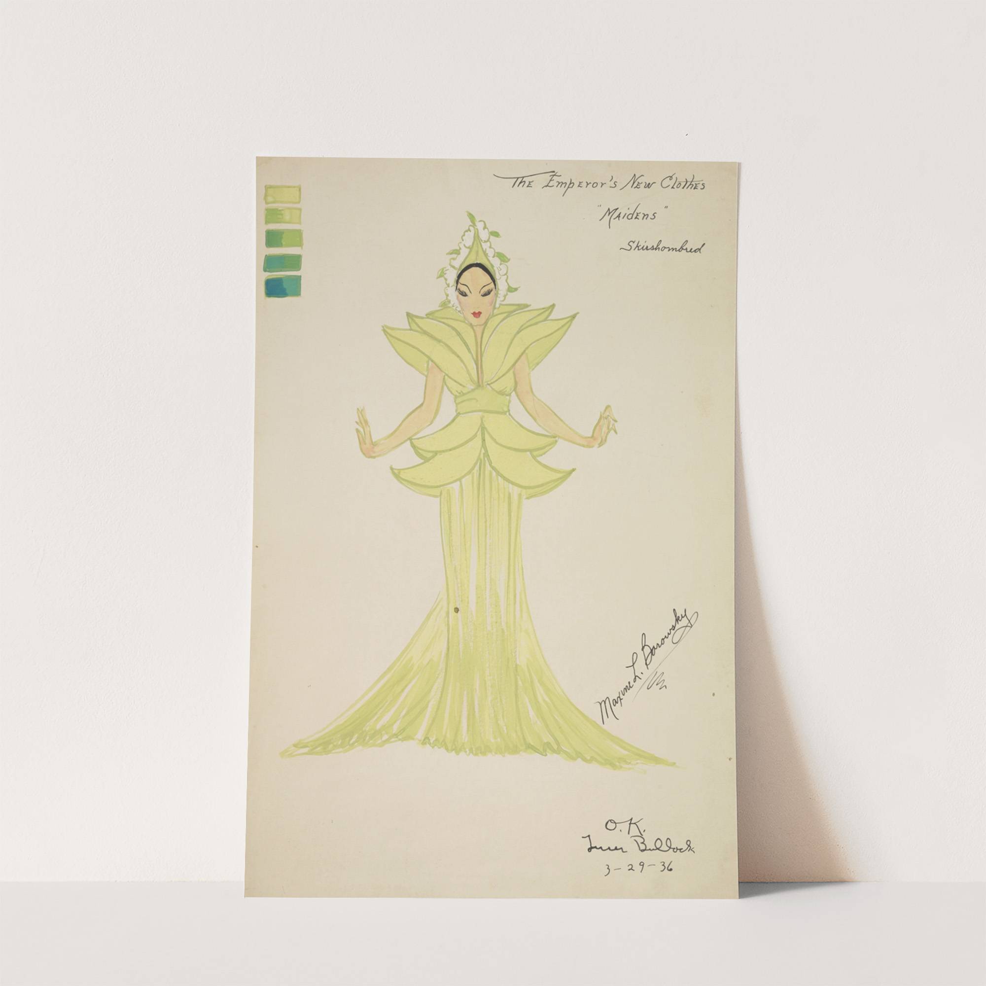Emperor’s New Clothes: Maidens green gown with top shaped like leaves (1934-1943) by Maxine Borowsky - Wall Art Print