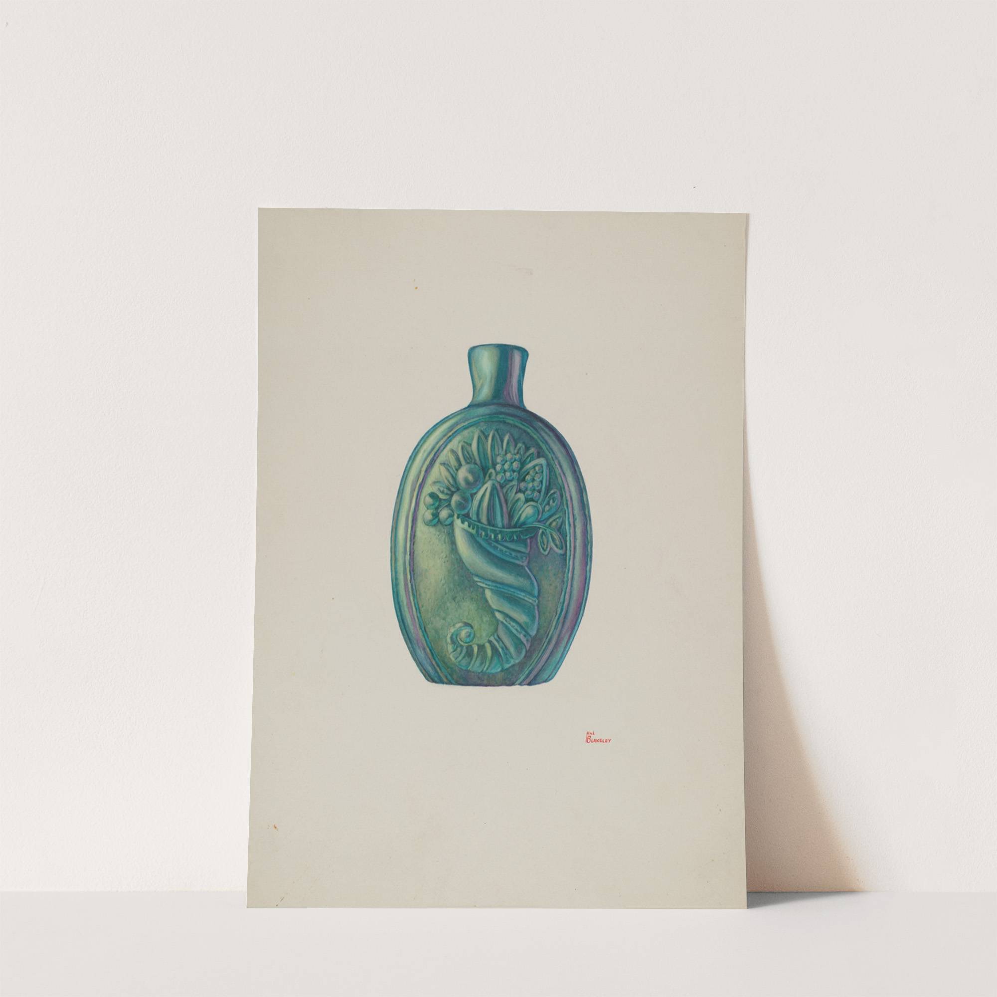 This art print features "Flask" by artist Hal Blakeney, rendered in a detailed, realistic style. The flask is depicted with a rich green-blue hue that gives it a slightly metallic appearance. The main focus of the image is an intricately...