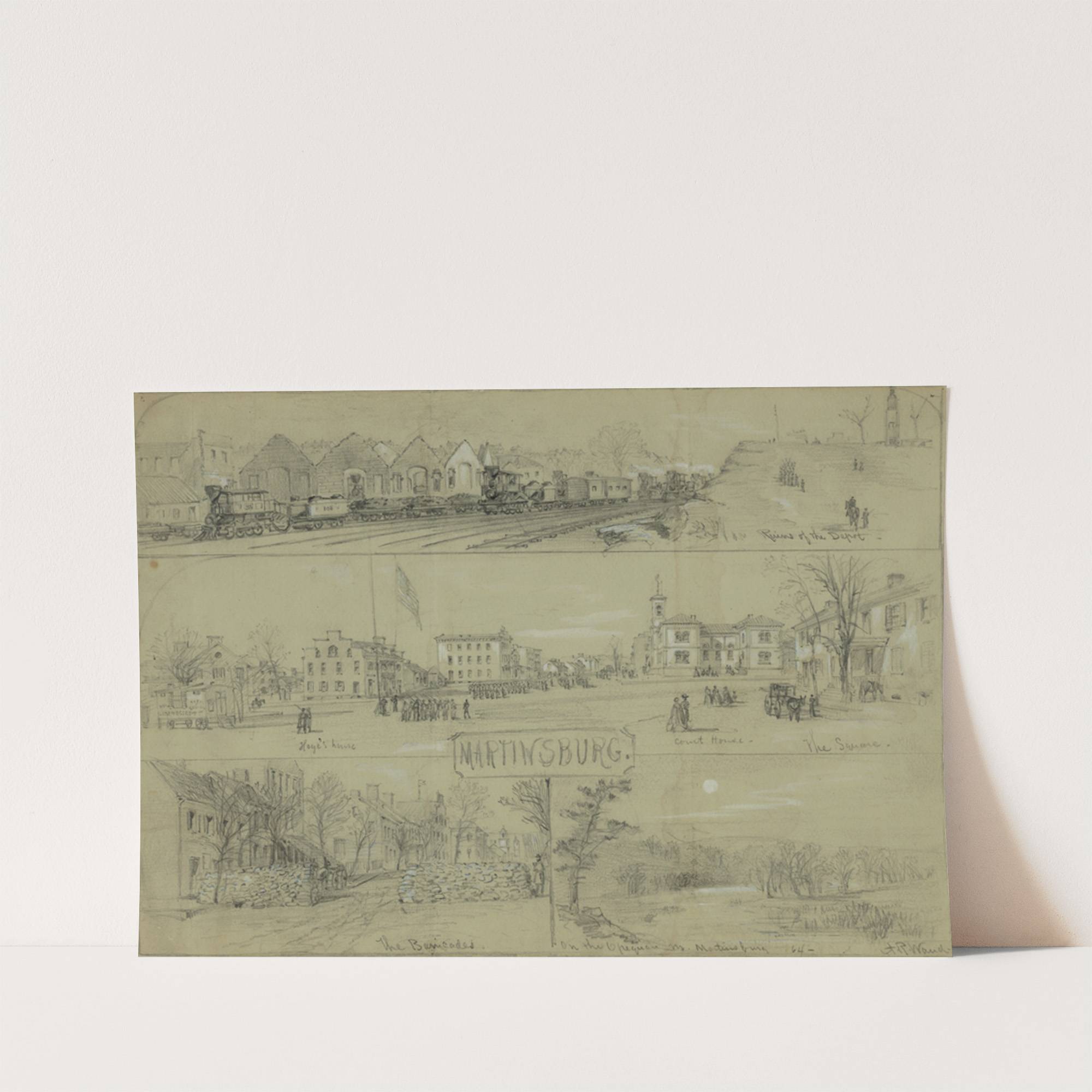 This stunning art print depicts "Martinsburg," a meticulously detailed historical drawing by the renowned artist Alfred Rudolph Waud. The artwork showcases an early 19th-century rural town scene, rendered in delicate pencil and ink with fine, precise lines that capture the...