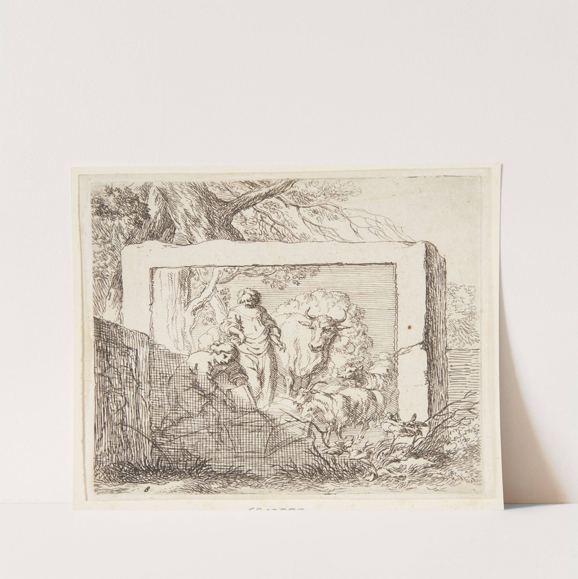 Stenblok med et basrelief forestillende en hyrde, der hælder vand i et trug by Nicolaes Pietersz. Berchem - Wall Art Print
