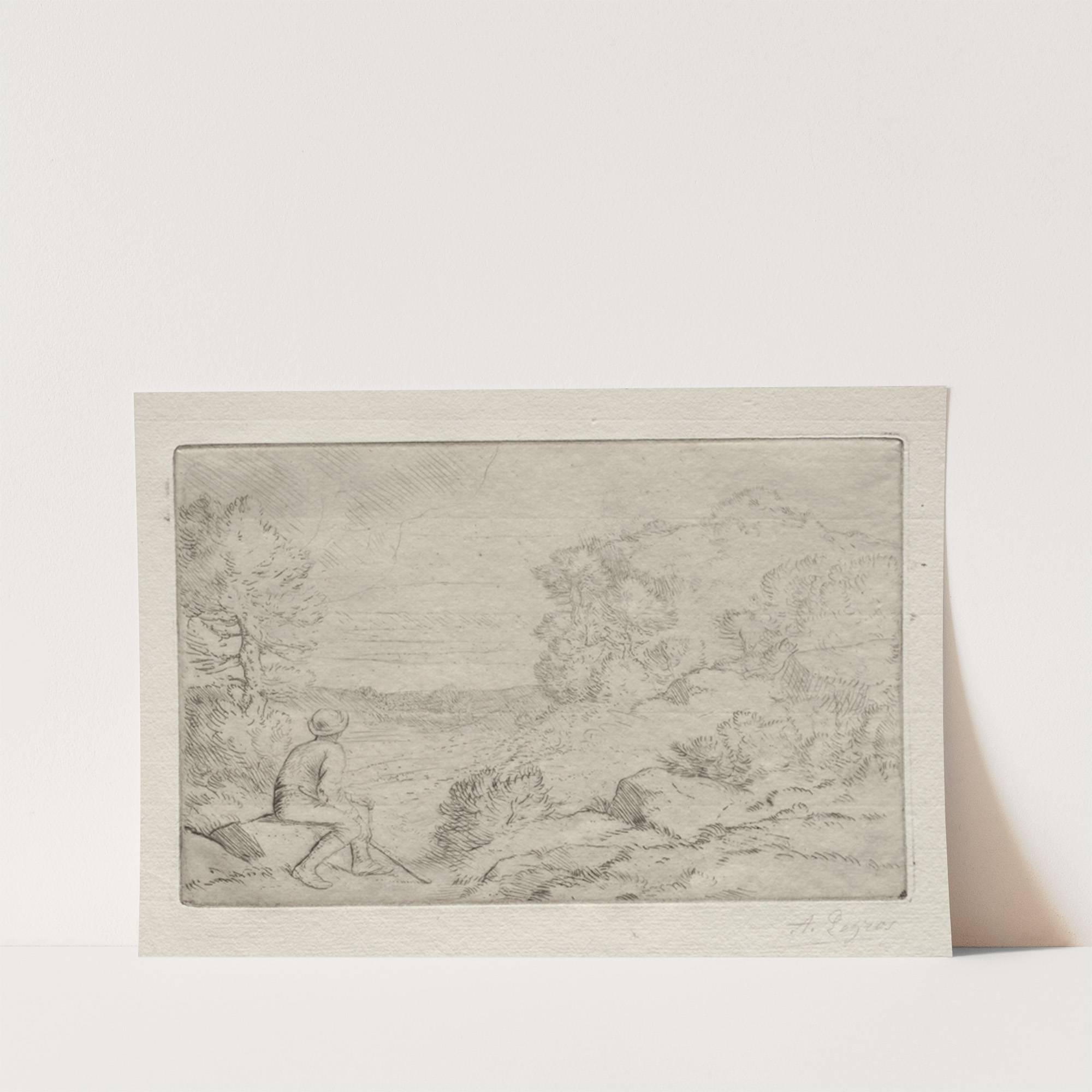 This black-and-white pencil drawing titled "The Rocks" by Alphonse Legros captures an idyllic landscape scene with delicate precision and subtle detail. In the foreground, a solitary figure sits on a rocky outcrop, gazing into a serene expanse of nature. The...