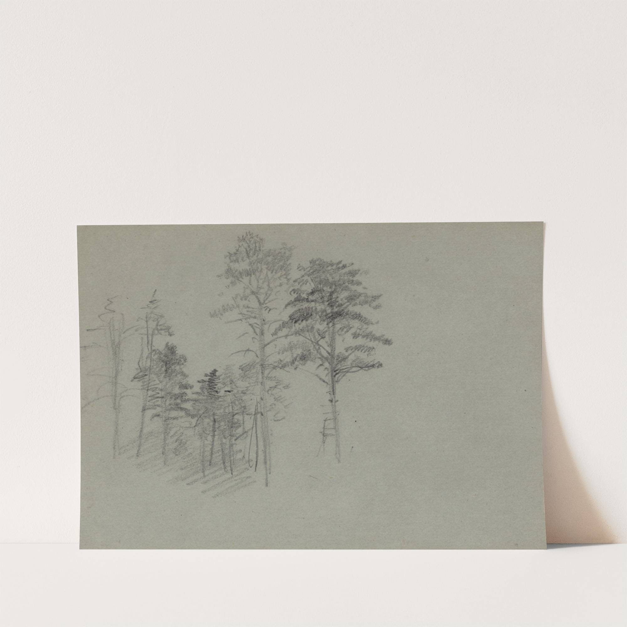 This elegant art print features a minimalist drawing of several tall trees, captured in delicate pencil strokes on a textured off-white background. The artist's subtle use of shading creates a sense of depth and movement among the slender trunks and...