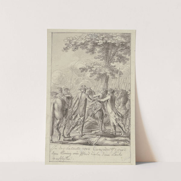 Zwei Soldaten helfen Friedrich dem Großen von einem zusammensinkenden Pferd by Daniel Nikolaus Chodowiecki - Wall Art Print