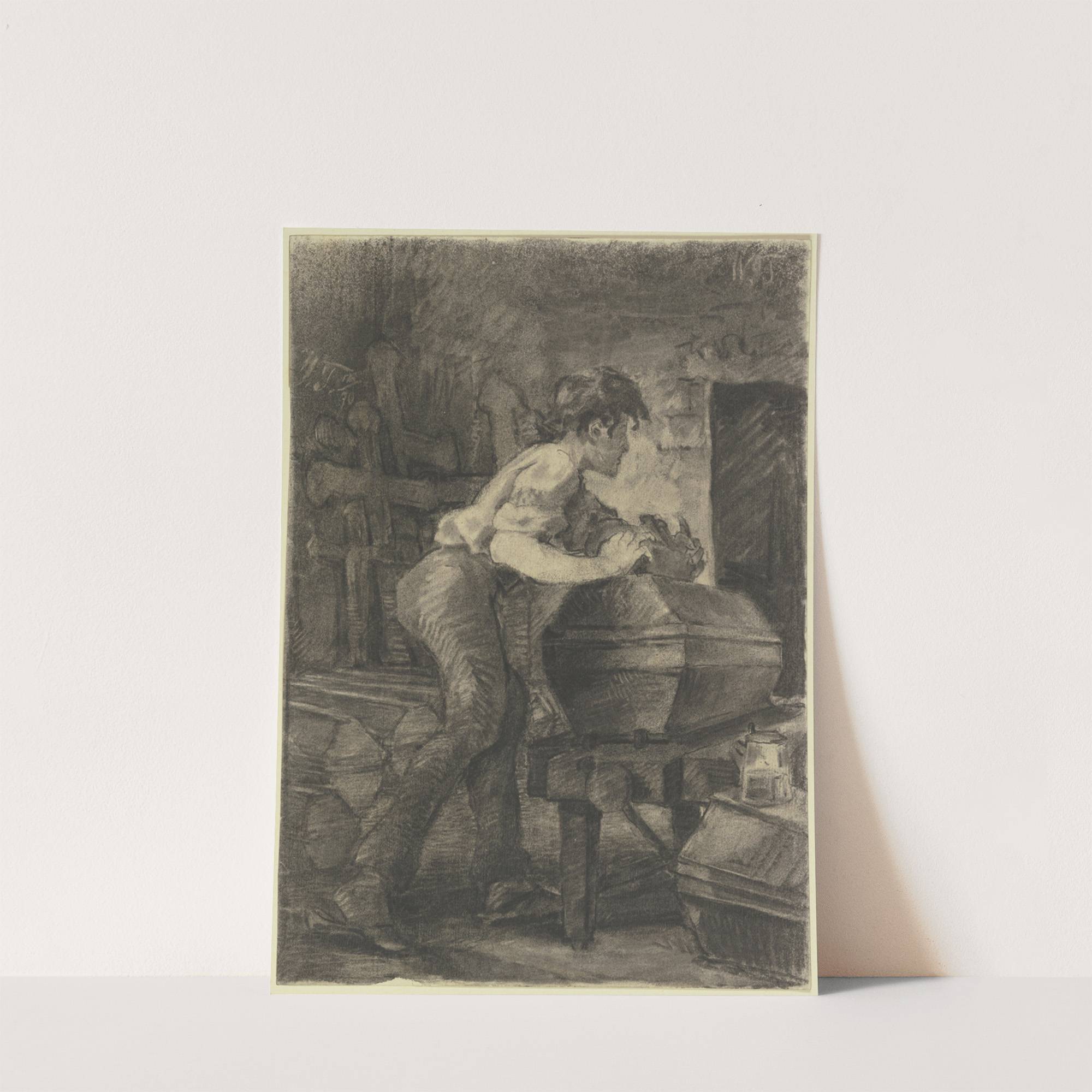 Ein junger Schreiner hobelt in der Werkstatt an einem Sarg by Wilhelm Trübner - Wall Art Print