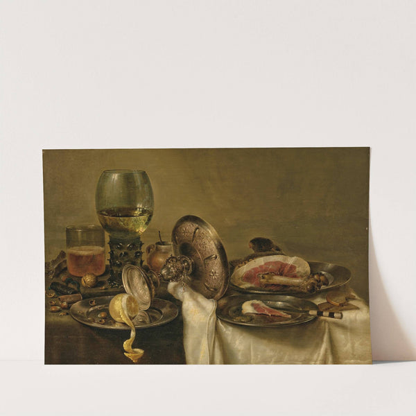 A partially draped table with an overturned tazza, roemer and glass of beer, with a partially peeled lemon and ham on pewter plates by Willem Claesz Heda - Wall Art Print