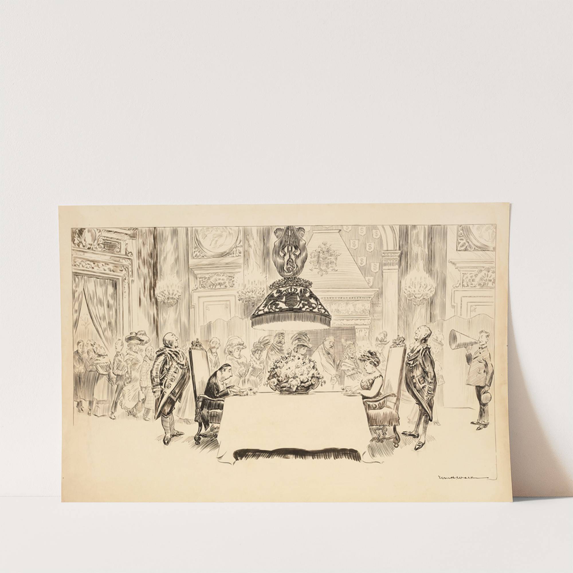 A fancy dinner party where only two guests are seated, eating. The rest stand and watch them. (1906) by William Henry Walker - Wall Art Print