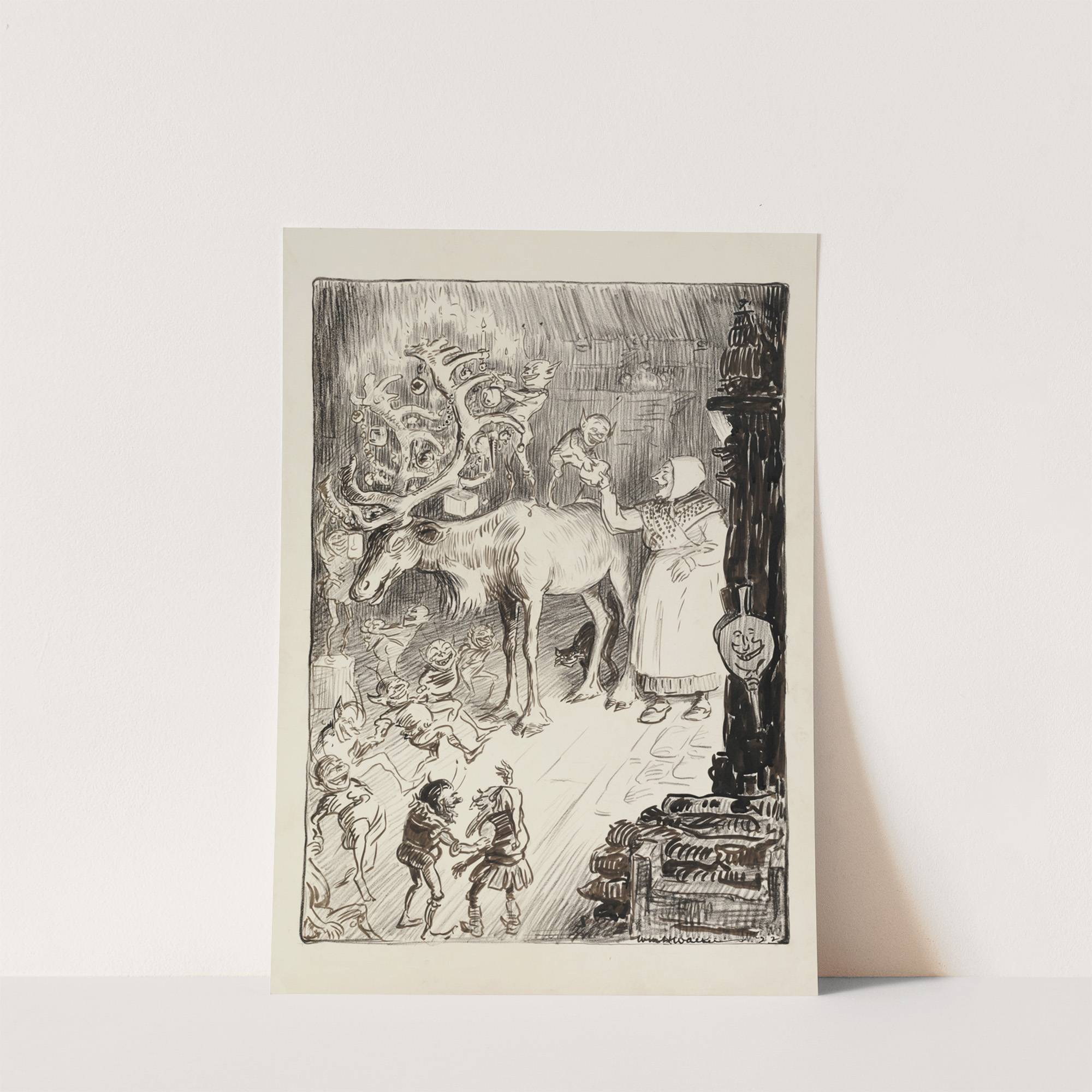 A group of elves hang Christmas decorations on the antlers of a reindeer, aided by a laughing woman (1922) by William Henry Walker - Wall Art Print