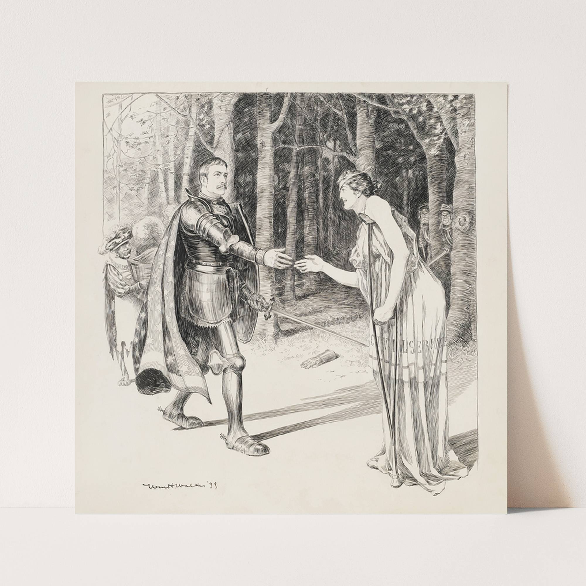 A knight rescues a wounded woman representing the Civil Service. Her would-be attackers lurk in the background. (1899) by William Henry Walker - Wall Art Print