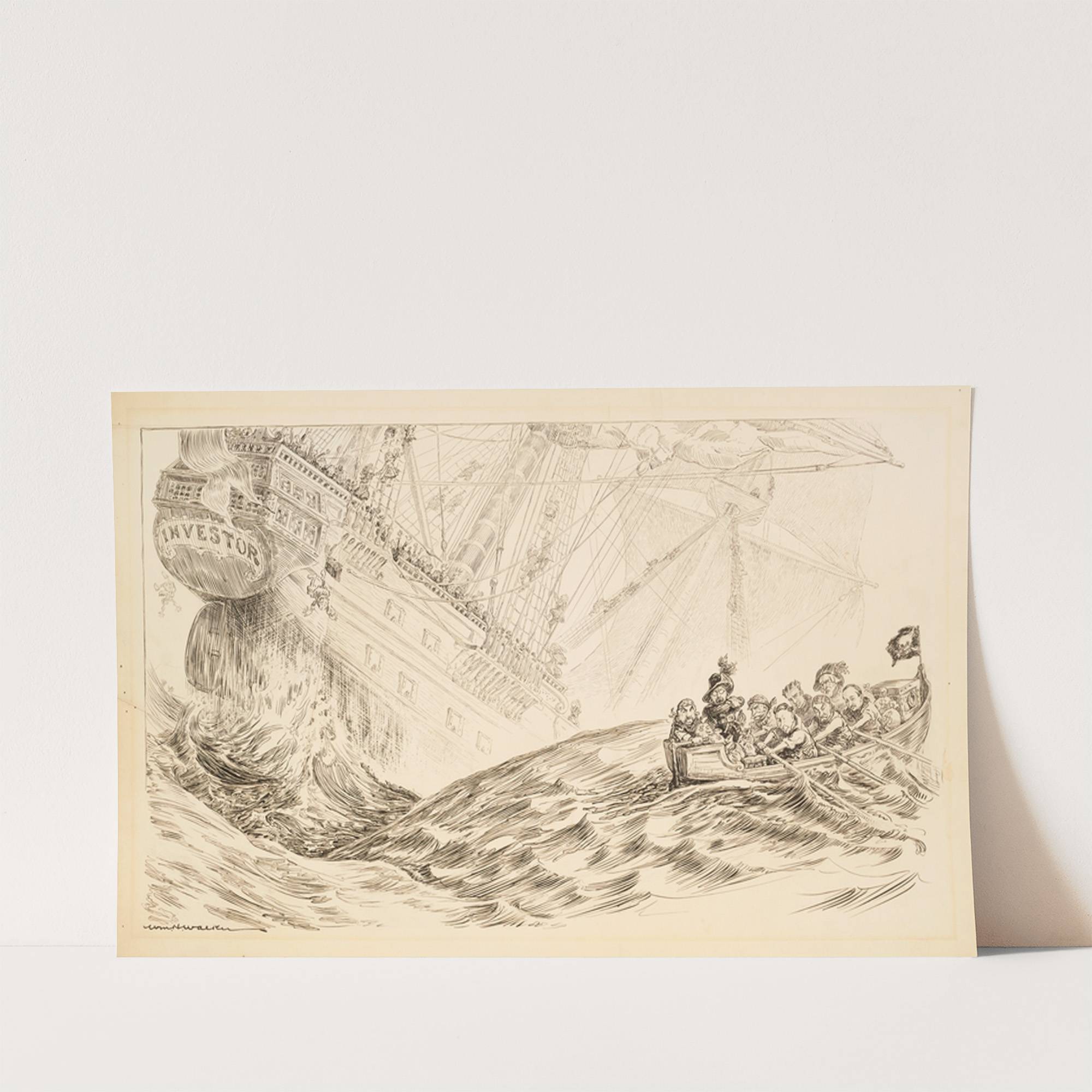 A large sailing ship representing investors sinks as a small group of pirates row away with their money. (1907) by William Henry Walker - Wall Art Print