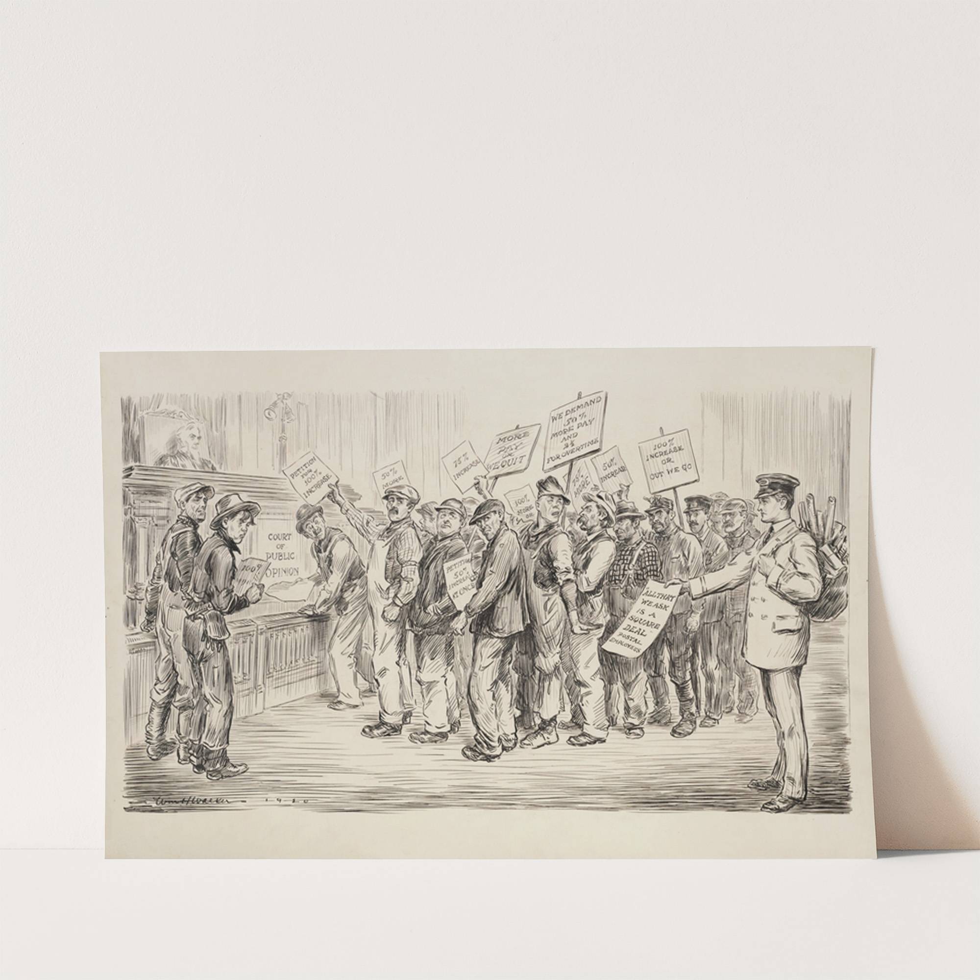 A line of men at the ‘court of public opinion’ representing various groups of labor demand 50-100% pay increases (1920) by William Henry Walker - Wall Art Print