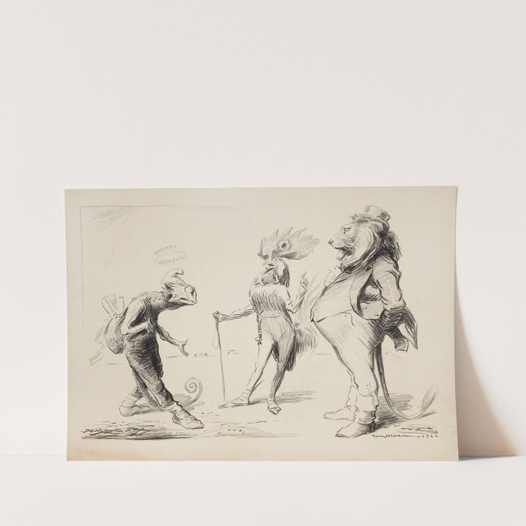A lion (England) and a rooster (France) confront a chameleon representing the German Republic (1921) by William Henry Walker - Wall Art Print