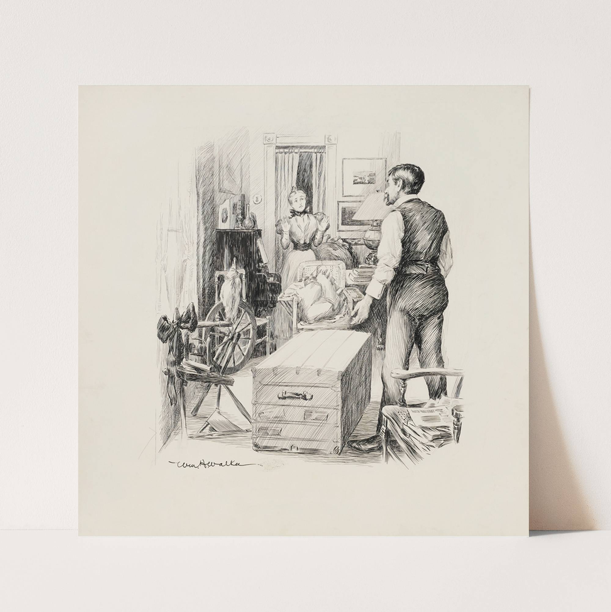 A man confronts a woman standing at a piano in a room with crowded with furniture, including a spinning wheel. (1897) by William Henry Walker - Wall Art Print