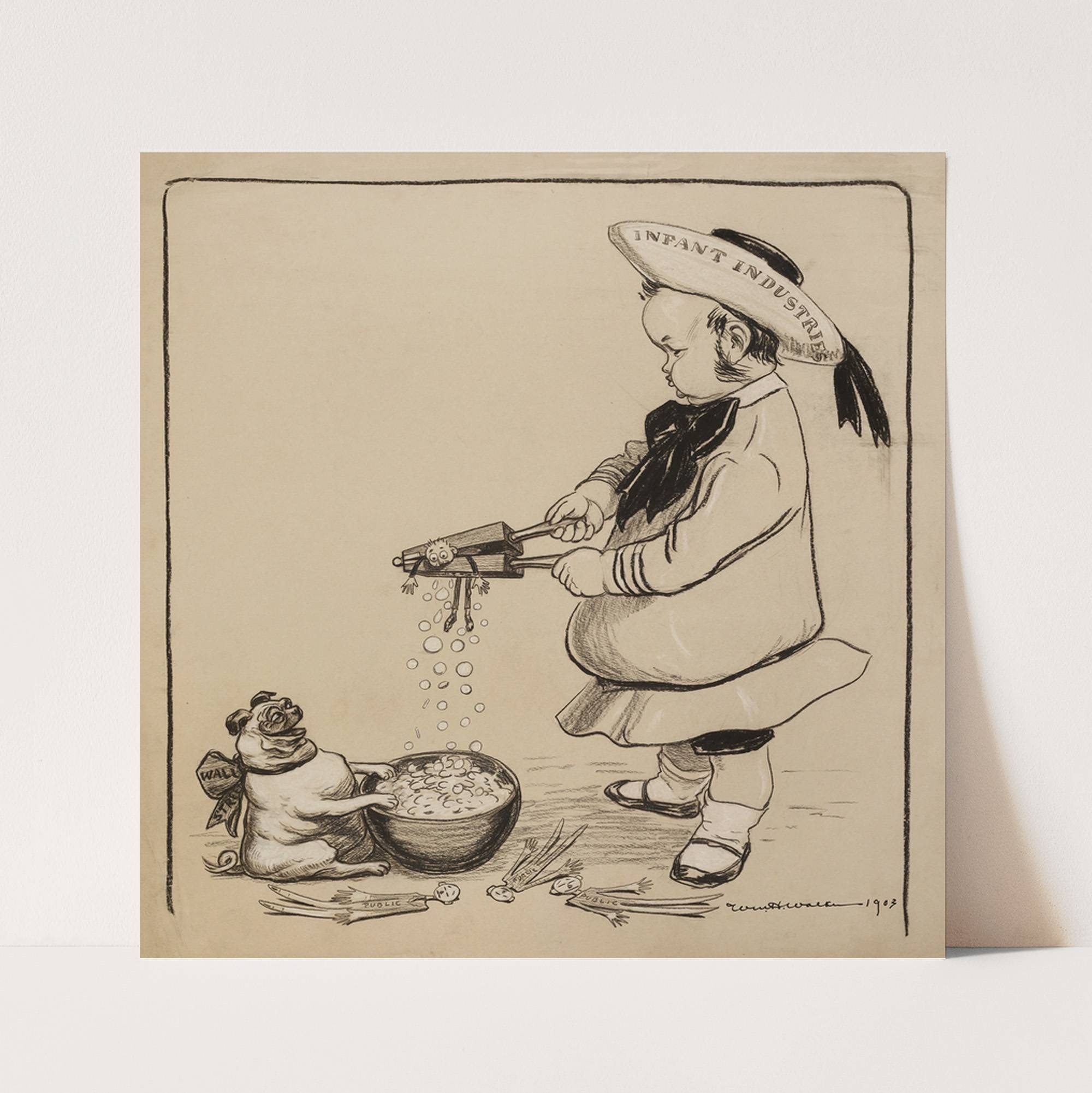 A man dressed as a child representing infant industries squeezes small men representing the public to make money fall out of them (1903) by William Henry Walker - Wall Art Print