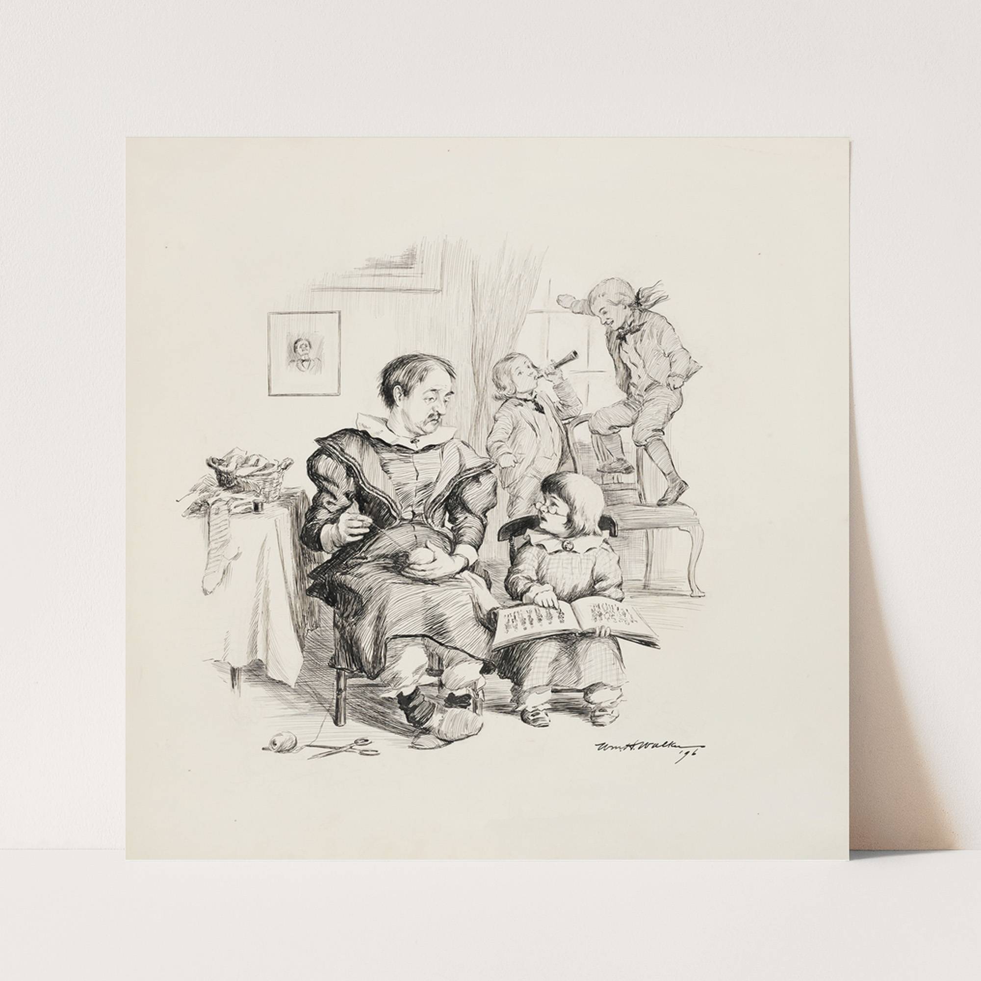 A man, dressed as a woman, darns socks and watches a little boy (his son), who is looking at a fashion book. Behind them, two girls play. (1896) by William Henry Walker - Wall Art Print