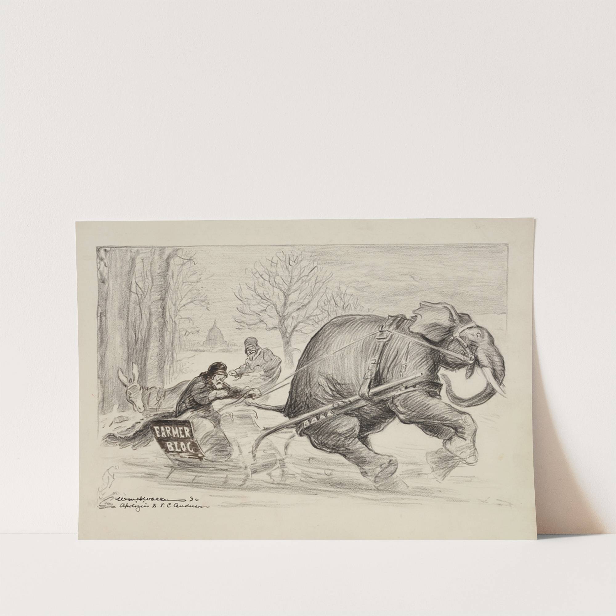 A man representing the ‘Farmer Bloc’ is pulled swiftly in a sleigh by the Republican Party elephant (1922) by William Henry Walker - Wall Art Print