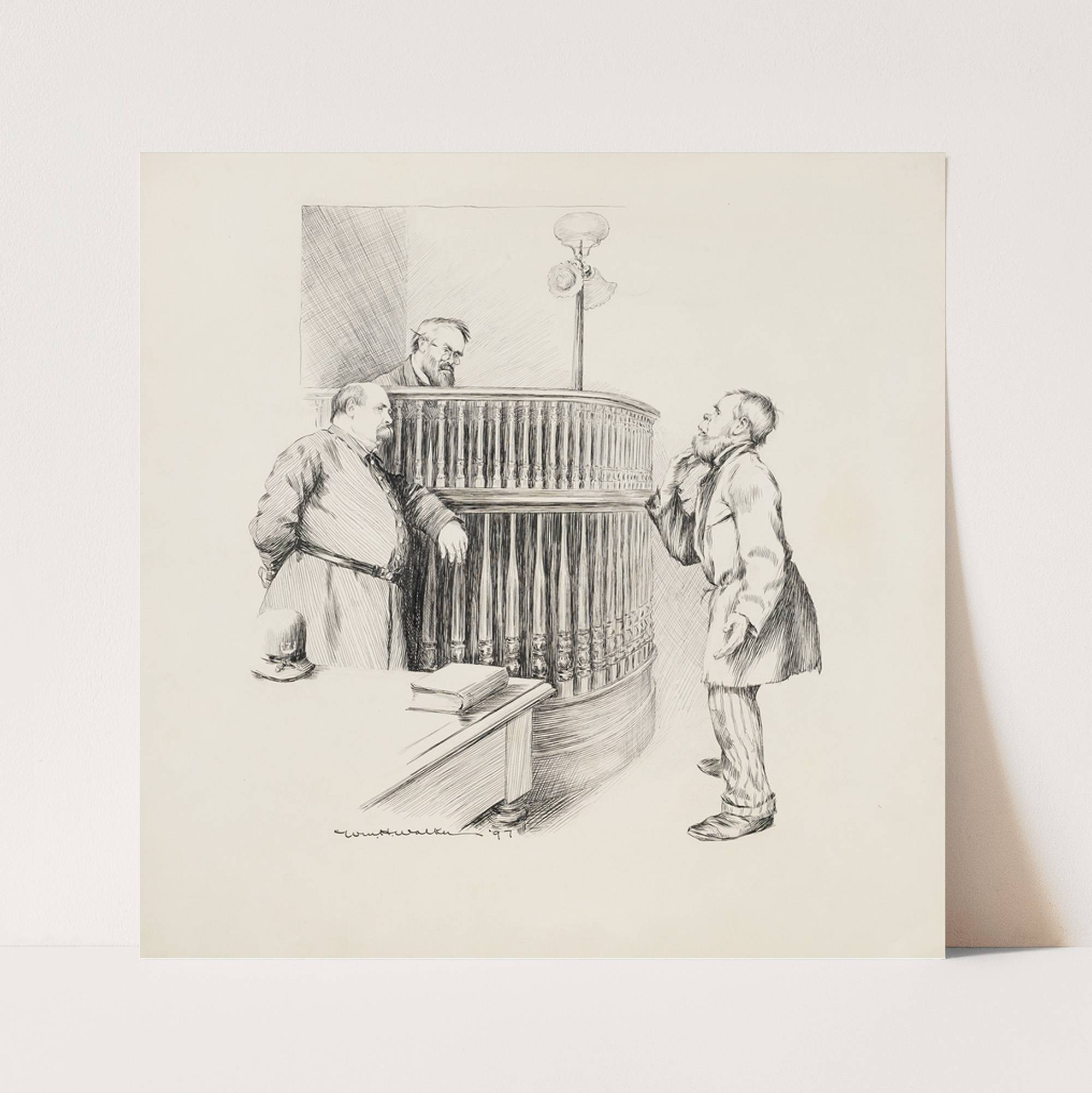 A man with a beard stands before a judge and a police officer. The man has a dark nose, possibly from drinking. (1897) by William Henry Walker - Wall Art Print