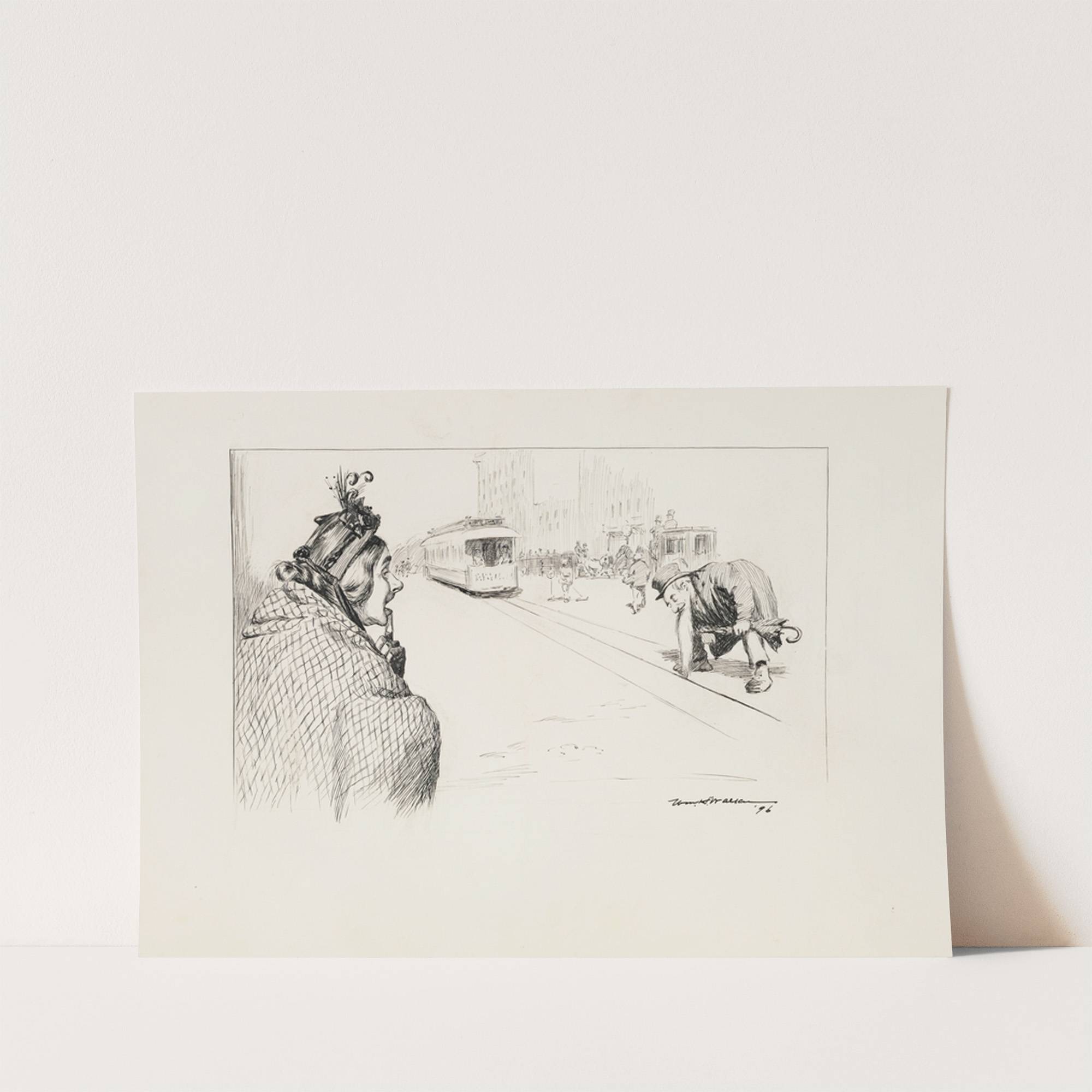 A man’s beard is stuck in the tracks of a trolley. (1896) by William Henry Walker - Wall Art Print