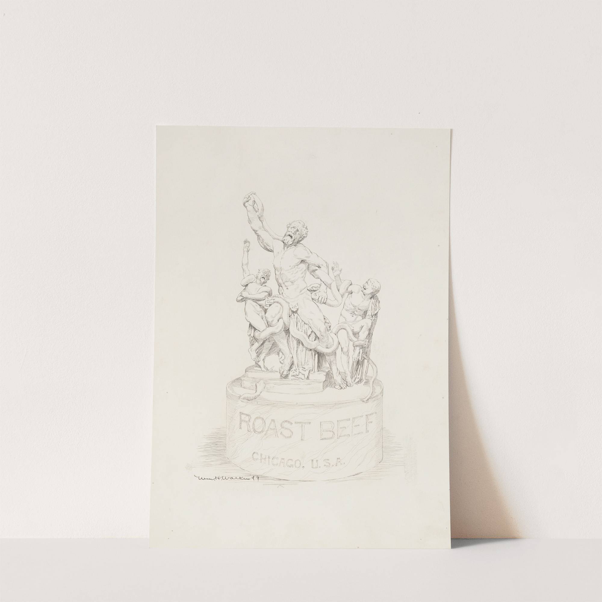 A statue of three men being attacked by snakes. The base of the statue reads ‘Roast Beef Chicago, U.S.A.’ (1899) by William Henry Walker - Wall Art Print