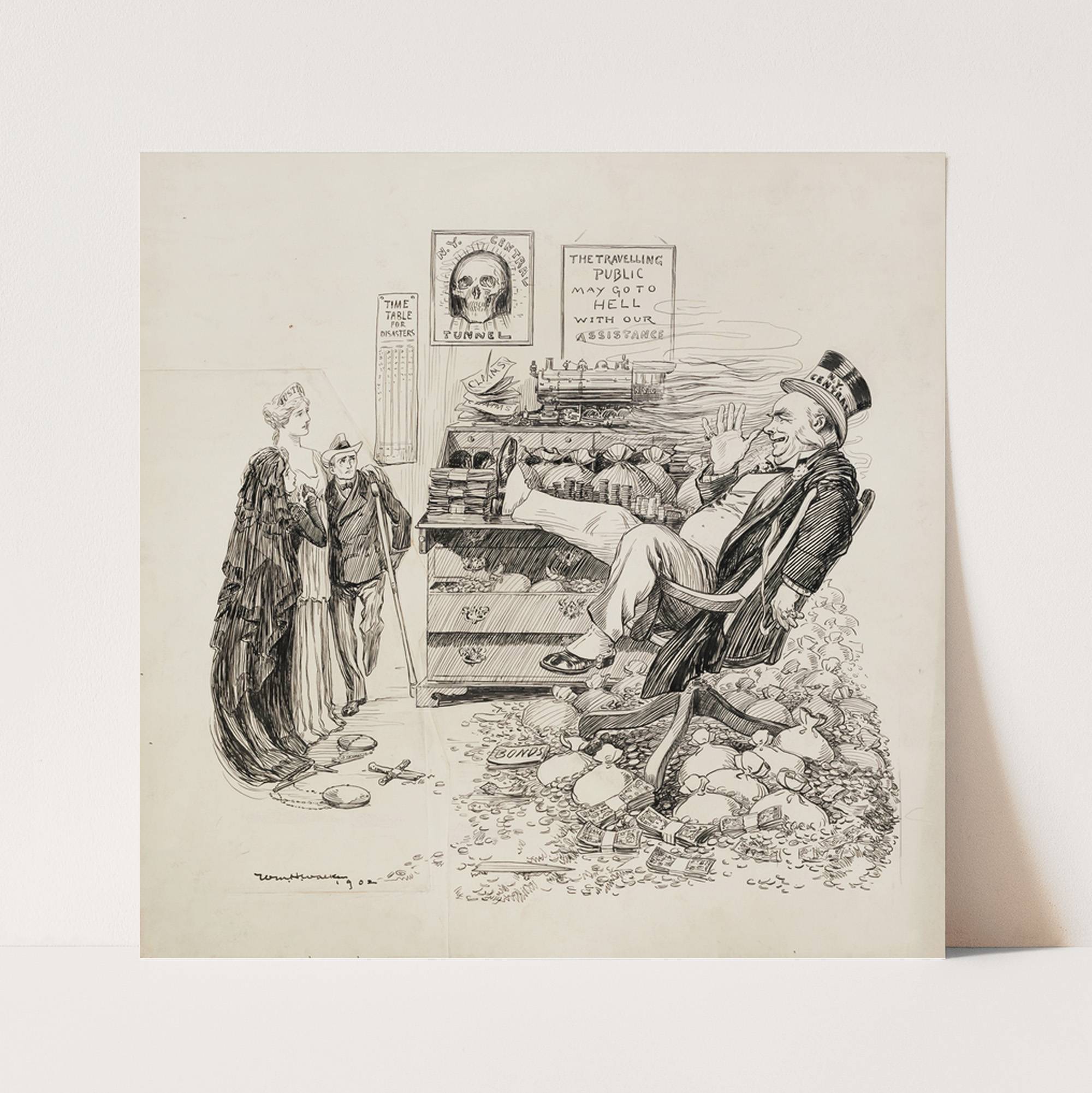 A wealthy man representing N.Y. Central thumbs his nose at a woman representing Justice who supports a widow and a man who has lost a leg (1902) by William Henry Walker - Wall Art Print