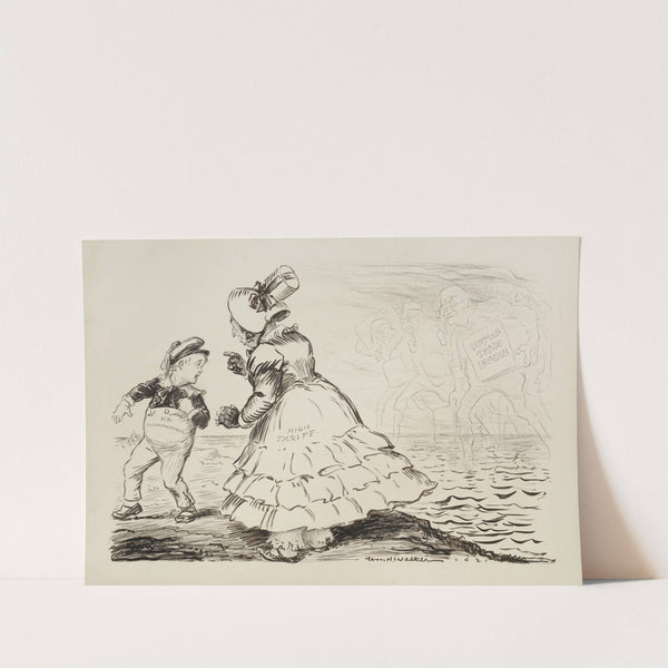 A young boy representing U.S. Manufacturers is kept away from the American shoreline by a woman representing high tariffs (1921) by William Henry Walker - Wall Art Print