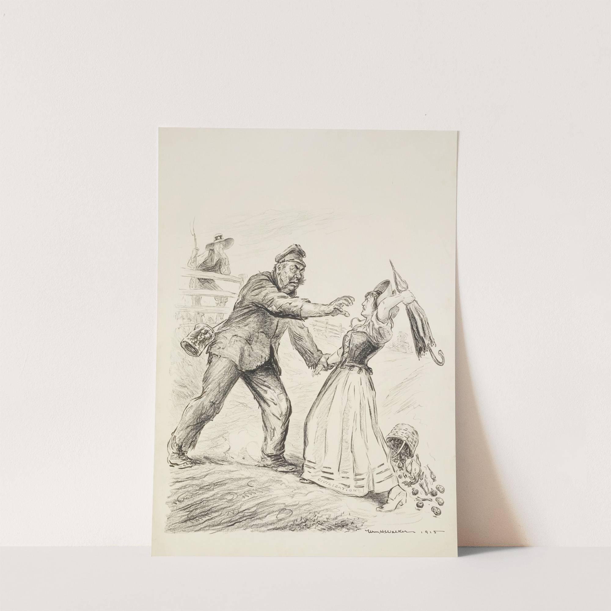 A young farm girl, representing civilization, is grabbed by a rough man representing Germany or Prussia and tries to defend herself with an umbrella (1916) by William Henry Walker - Wall Art Print