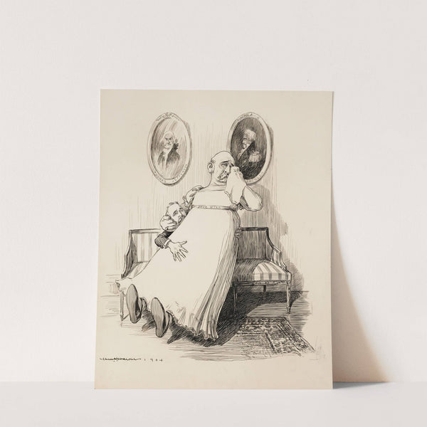 Dave Hill, dressed as a woman, weeps and sits on the lap of a man (1904) by William Henry Walker - Wall Art Print