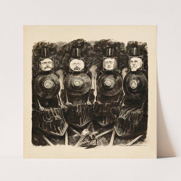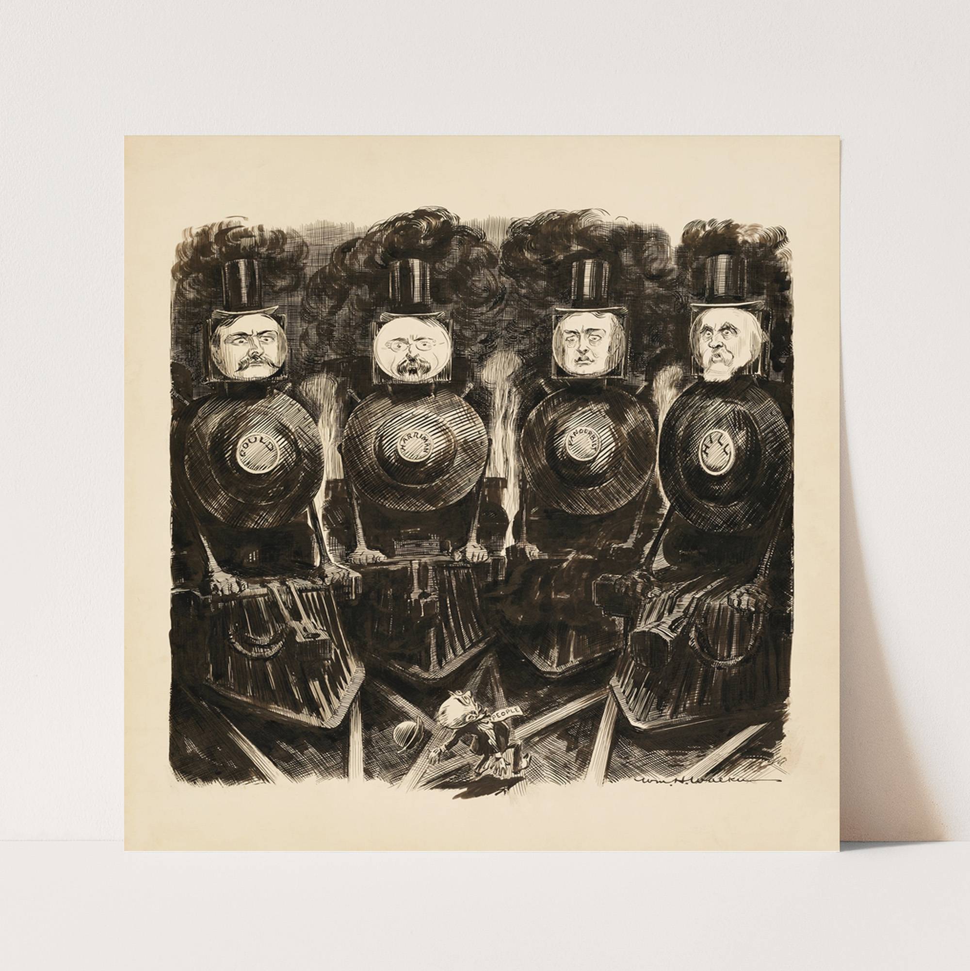 Gould, Harriman, Vanderbilt, and Hill, depicted as trains, about to run over a small man representing the people. (1907) by William Henry Walker - Wall Art Print