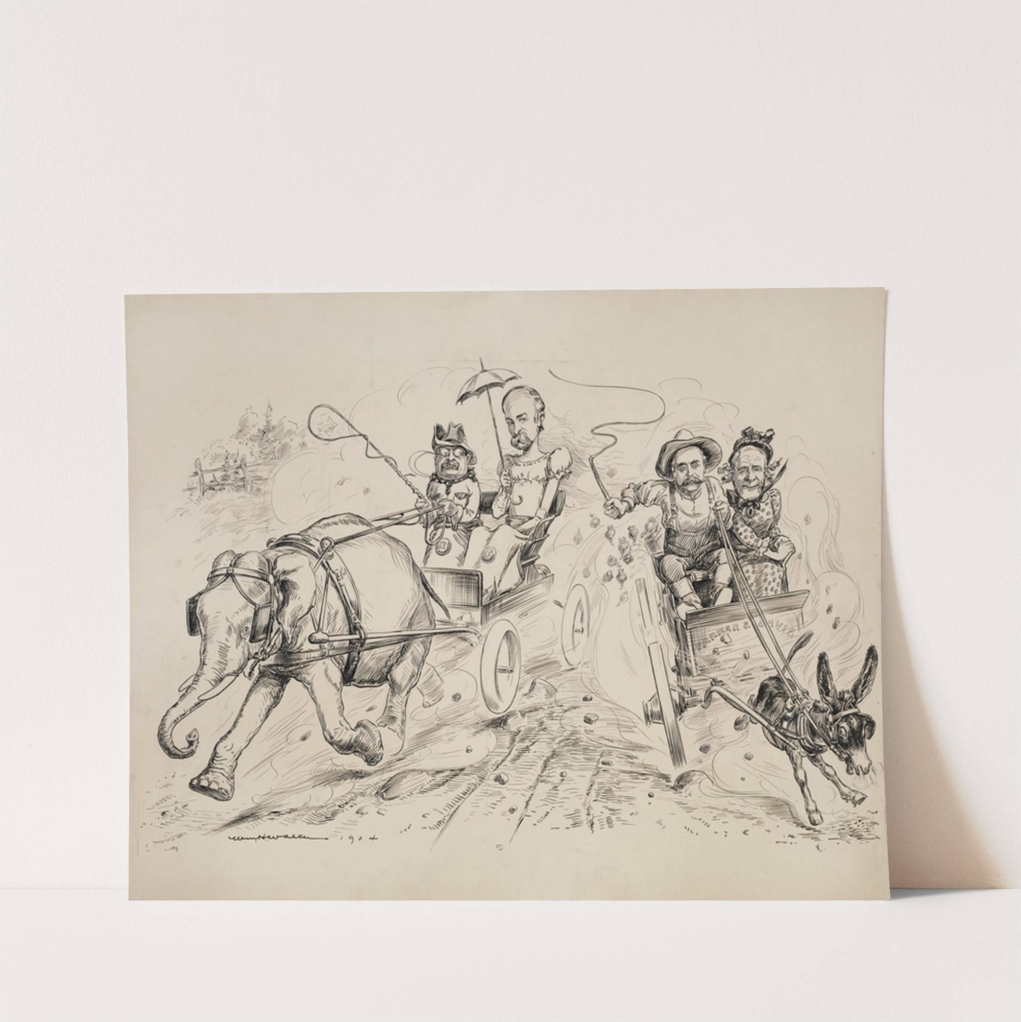 President Theodore Roosevelt and Vice Presidential candidate Charles Fairbanks (depicted as a woman) ride together in a carriage (1904) by William Henry Walker - Wall Art Print